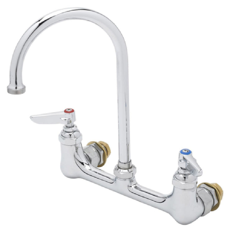 This wall-mount faucet is engineered for commercial foodservice applications involving frequent use, featuring durable polished brass construction, precise 8" adjustable centers, and a gooseneck spout for high-clearance access. Its quarter-turn compression cartridges with spring checks deliver reliable, maintenance-friendly performance, while lever handles with color-coded indexes simplify user operation. Designed for easy installation on backsplash mounts, it supports high workflow efficiency and long-term durability under demanding kitchen conditions.