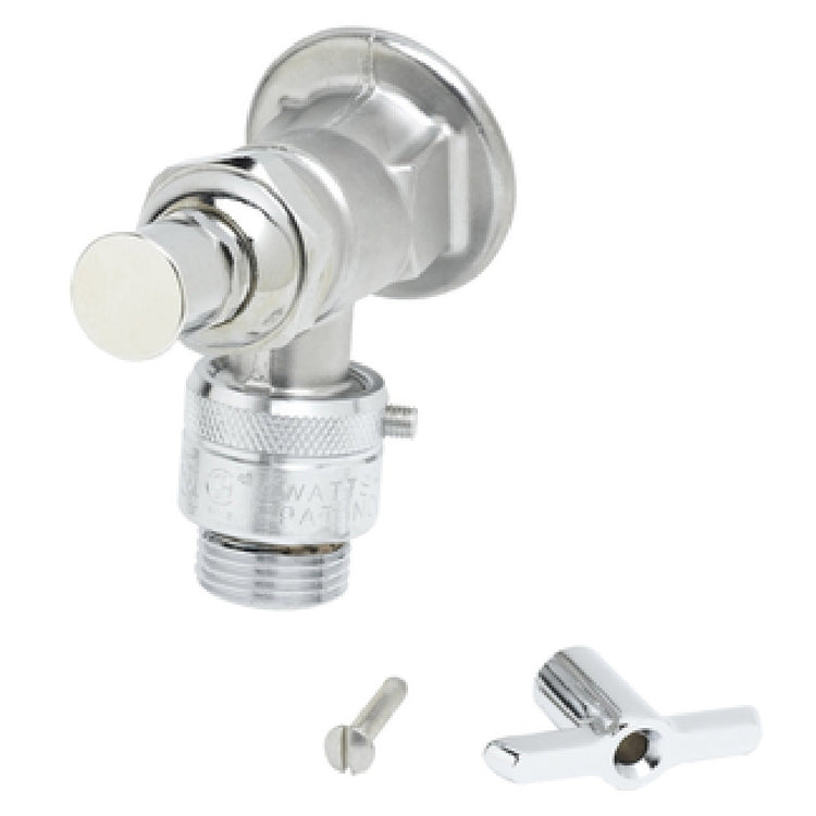 T&S Brass, B-0737, Sill Faucet, with vacuum breaker, 3/4" flanged female inlet, 3/4" hose thread on vacuum breaker outlet, attached loose key handle with vandal resistant screw, bronze body, rough chrome finish