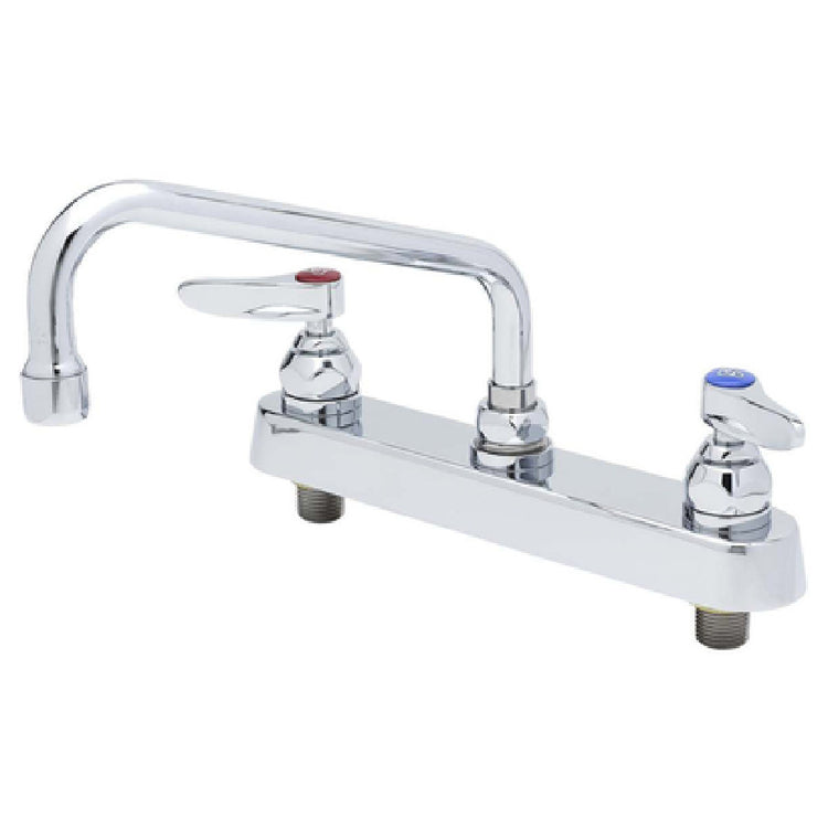 The T&S Brass B-1122 Faucet is a commercial-grade deck-mounted fixture designed for professional kitchens requiring durable and precise water dispensing solutions. Featuring a 10-inch swing nozzle, it offers flexible reach for various industrial foodservice applications. Equipped with quarter-turn Eterna cartridges and lever handles, this faucet ensures smooth operation and accurate control. Built with low lead materials, it adheres to safety standards for food contact environments, providing a reliable solution for high-demand settings such as restaurant kitchens, catering facilities, and institutional foodservice. With precise 8-inch faucet centers and a swivel spout type, the B-1122 model supports efficient workflow in demanding culinary environments. Its robust construction and technical specs make it ideal for sustained commercial use, ensuring longevity and consistent performance.