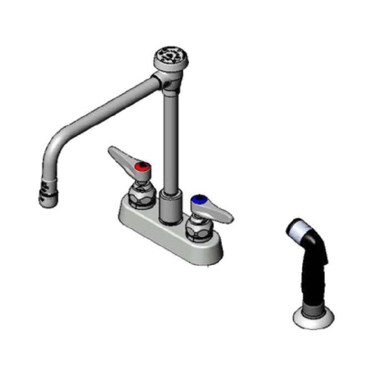The T&S Brass B-1177 faucet features a stainless steel body finished in a robust, corrosion-resistant coat, with a weight of approximately 5.75 lbs. Its design accommodates deck mounting with a 4-inch centers configuration, compatible with standard foodservice workboards. The model incorporates a rigid vacuum breaker nozzle, ensuring compliance with backflow prevention standards, and features a side spray for enhanced cleaning efficiency. It operates reliably within standard commercial water pressure systems, with no electrical requirements, supporting all typical kitchen plumbing setups. The unit’s dimensions fit seamlessly into food prep areas, with durable construction designed for frequent use, and the entire assembly is engineered for straightforward disassembly for maintenance.