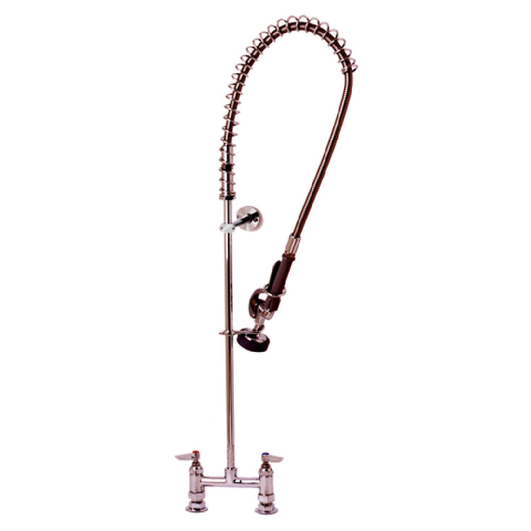 T&S Brass, B-2223, EasyInstall Pre-Rinse Unit, deck mount base, 6" center, spring action gooseneck, 1.15 GPM spray valve (B-0107), 24" riser, 44" flexible stainless steel hose, 6" wall bracket, 2" Ø deck flanges with 1/2" NPT female flanged inlets, lever handles, quarter-turn Eterna cartridges, low lead, 2019 DOE PRSV - Class II