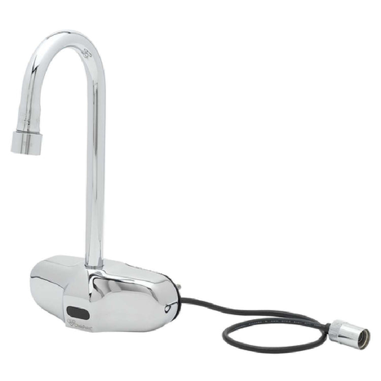T&S Brass, EC-3105-VF5-TMV, ChekPoint™ Electronic Faucet, wall mount, 4" centers, rigid gooseneck spout, 0.5 GPM vandal resistant non-aerated spray device, AC/DC control module with internal flow control, thermostatic temperature control mixing valve with integral check valves, chrome-plated brass, flexible stainless steel supply hoses, ADA Compliant