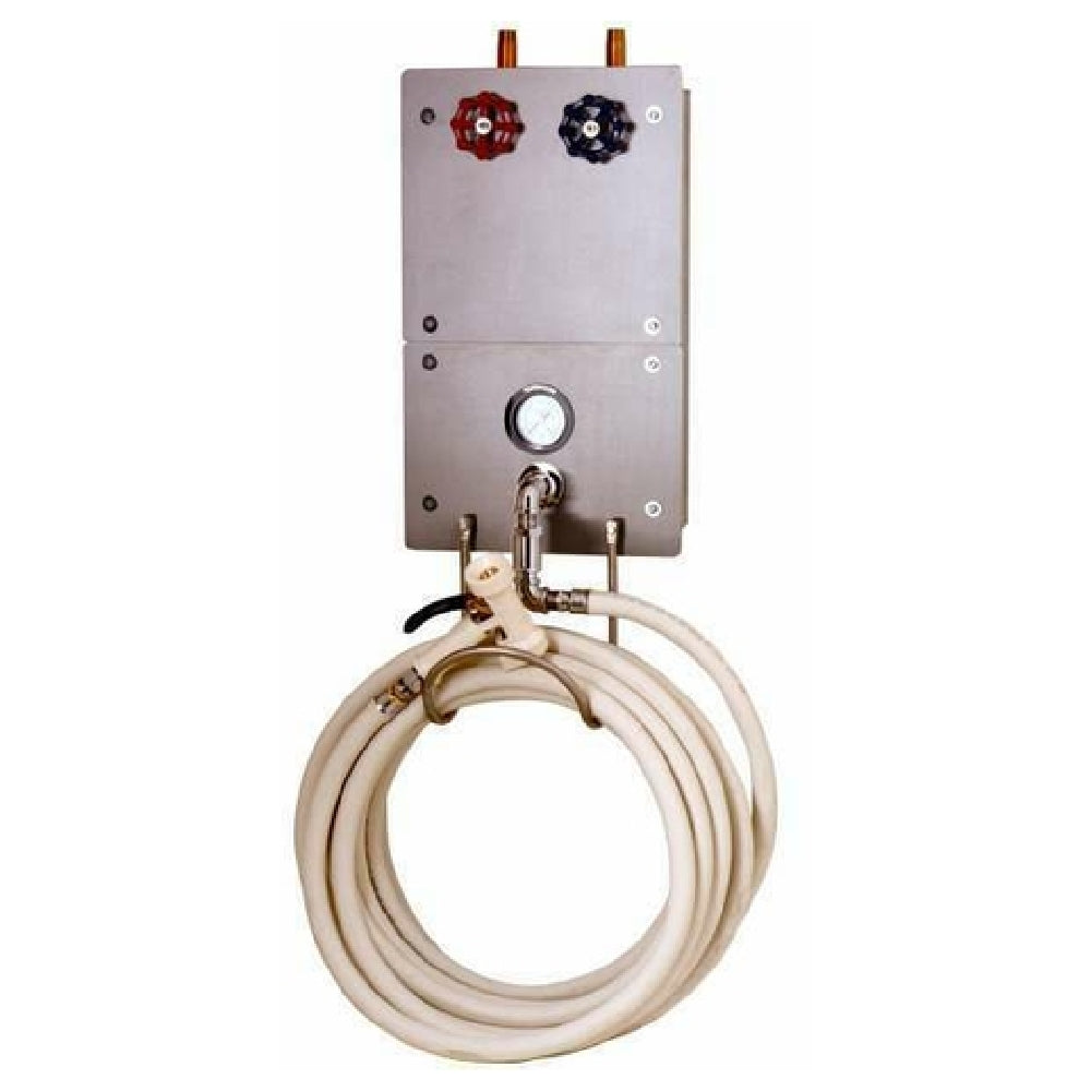 The T&S Brass MV-0771-12R washdown faucet operates with standard plumbing connections and features a stainless steel construction for durability in demanding environments. It includes a 3/4" mixing valve for precise control and a stainless steel thermometer for monitoring water temperature. The system supports intensive sanitation workflows, with a 50-foot flexible hose and rear trigger water gun ensuring optimal reach and flow rate. Its installation requires wall mounting within typical commercial kitchen layouts, and maintenance involves straightforward disassembly of stainless steel components for cleaning. Weighing 82 lbs, the system is designed for installation flexibility and resilience in foodservice environments.