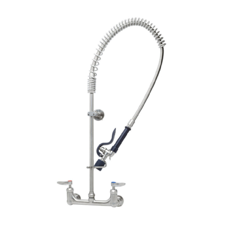 The T&S Brass S-0133-CR-BJ EverSteel 8” Wall Mount Mixing Faucet With Body and 18” Riser is a commercial-grade plumbing fixture designed for precise temperature control in professional kitchen environments. Constructed from durable stainless steel with a sleek finish, this wall-mounted faucet features an 8-inch center spacing and a 33.31-inch height for versatile installation. Its ceramic cartridges with check valves ensure long-lasting reliability and leak prevention, while the 44-inch flexible hose with heat-resistant handle offers enhanced maneuverability. The 1.07 GPM blue spray valve delivers efficient water flow, optimized for food prep and sanitation tasks. Certified to industry standards, it is suitable for high-demand food service settings requiring durable, hygienic, and efficient fixtures.