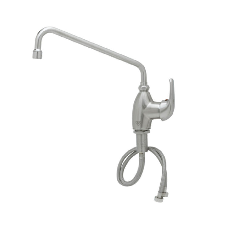 The T&S Brass S-2785-S062X single lever faucet features a stainless steel body with a height of 10.62 inches, a width of 4.87 inches, and a total depth of 12 inches. It incorporates ceramic valve technology for precise control and longevity, and its spout length ranges from 12 to 14 inches with a standard swivel/swivel nozzle. The fixture weighs approximately 5 pounds, designed for deck mount installation compatible with common commercial sinks. Its corrosion-resistant construction ensures reliability in frequent use environments, and it complies with NSF standards for food safety. The faucet is supplied with 18" flexible supply hoses featuring G1/2 female swivel fittings, facilitating flexible connectivity and straightforward maintenance. It is optimized for indoor water supply systems with typical pressure and temperature ranges encountered in commercial kitchens, providing consistent performance with minimal upkeep.