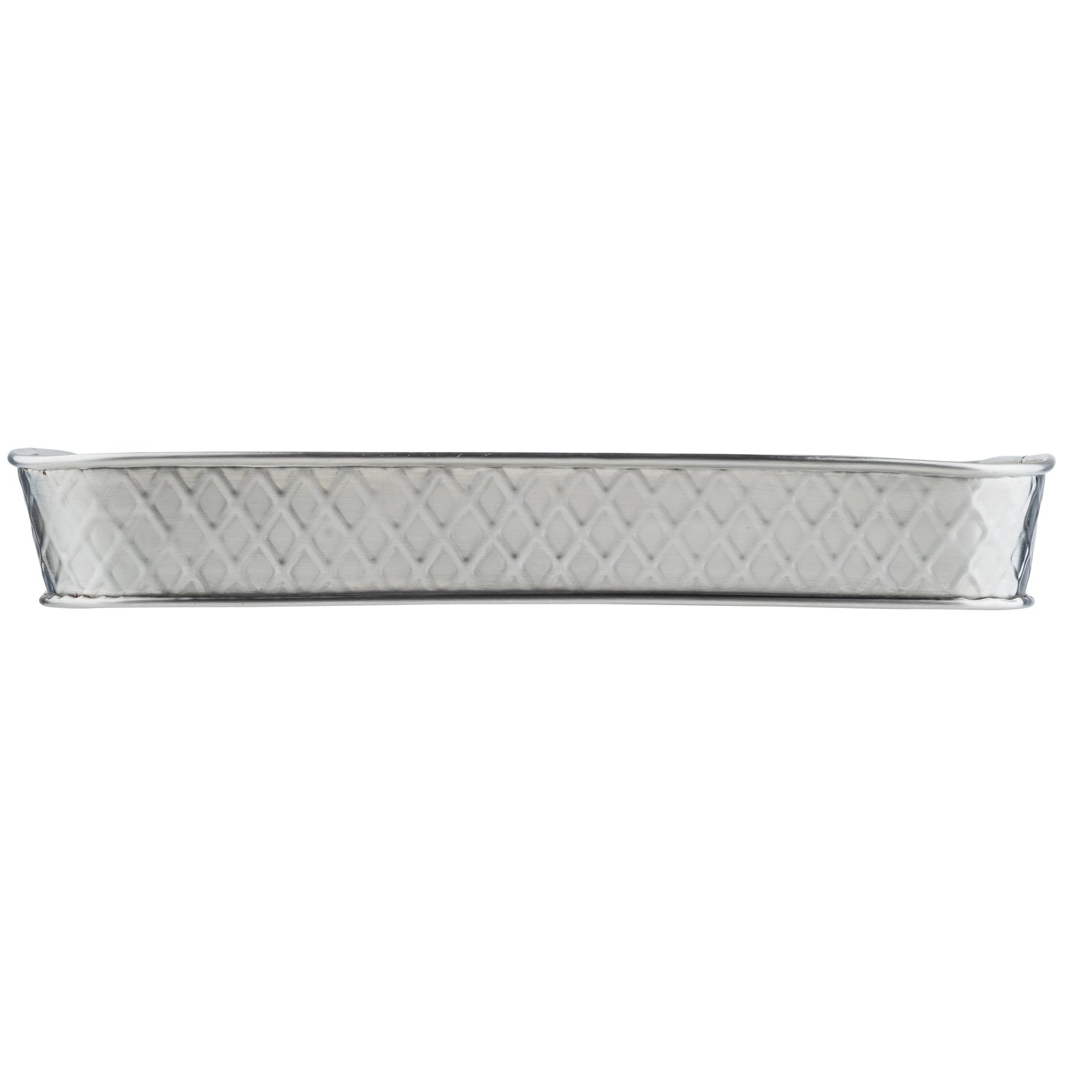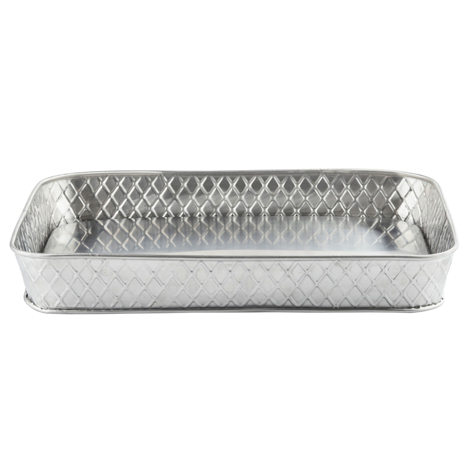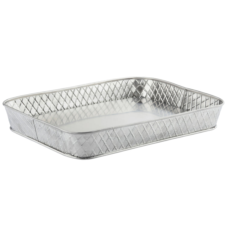A rectangular, shallow metal baking pan with rounded corners and a diamond-patterned, textured exterior from the TableCraft Products Lattice Collection Platter. Its shiny silver finish and smooth interior contrast beautifully with the patterned outer sides.