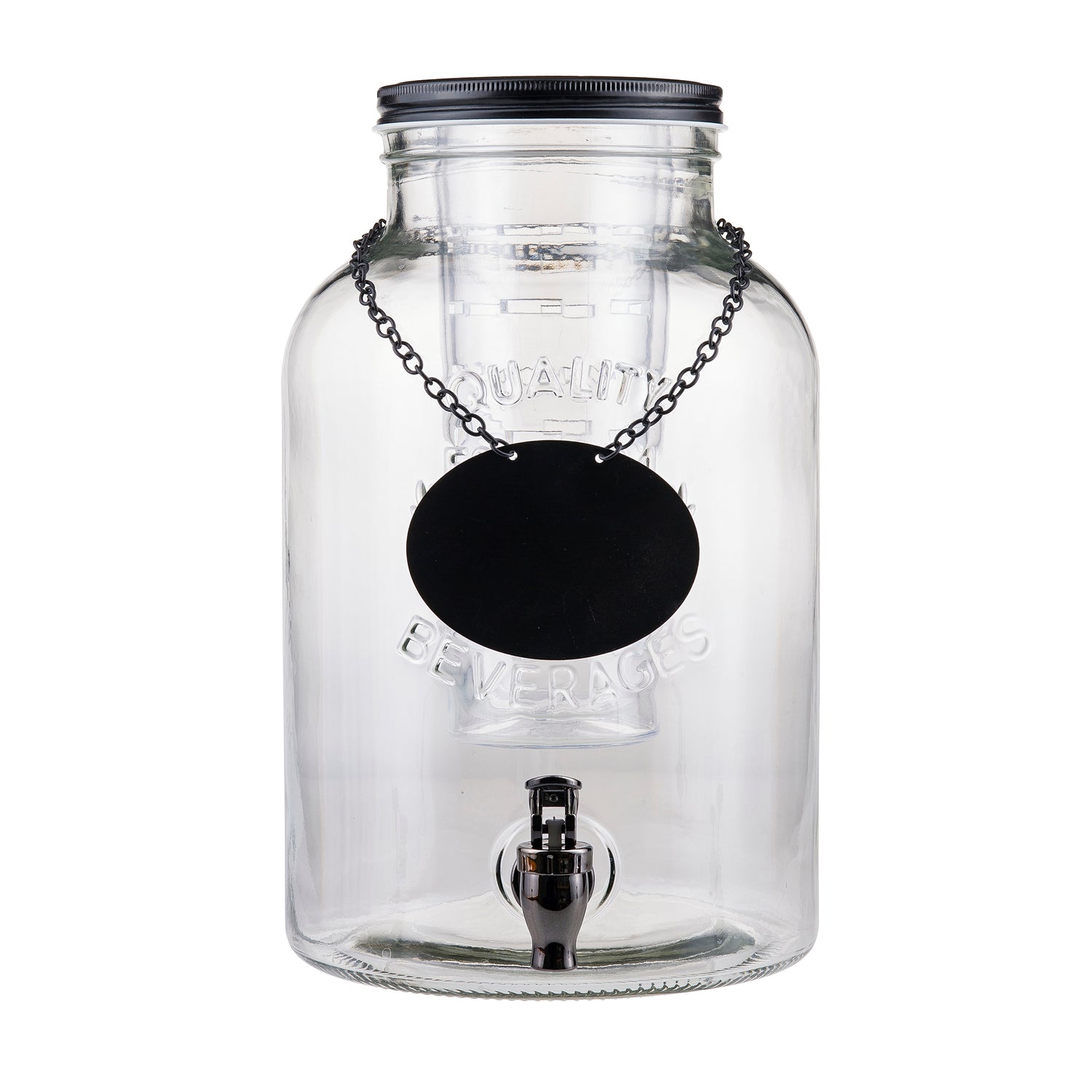 The Tablecraft 10090 Industrial Collection™ Beverage Dispenser is a commercial-grade, non-insulated beverage dispensing solution designed for high-volume foodservice environments. With a 2-gallon capacity, this unit measures 10 inches in width, 8 inches in depth, and stands 12-3/4 inches tall, making it suitable for countertop operation in busy cafes, catering services, and buffet stations. Constructed from durable glass, it features an integrated ice core, infuser, and chalkboard necklace for customizable presentation and beverage identification. Its design emphasizes ease of access, cleaning, and longevity, supporting efficient workflow in foodservice settings requiring reliable beverage service with proven technical specifications.
