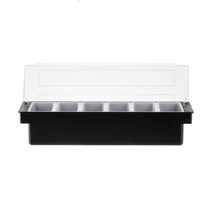 The Tablecraft 102 condiment holder offers a robust, impact-resistant ABS plastic design with six large compartments, making it a reliable choice for high-volume bar operations. Its clear lid improves visibility, while dishwasher-safe construction simplifies maintenance. The precise dimensions maximize counter space, supporting efficient service and presentation in busy hospitality environments.