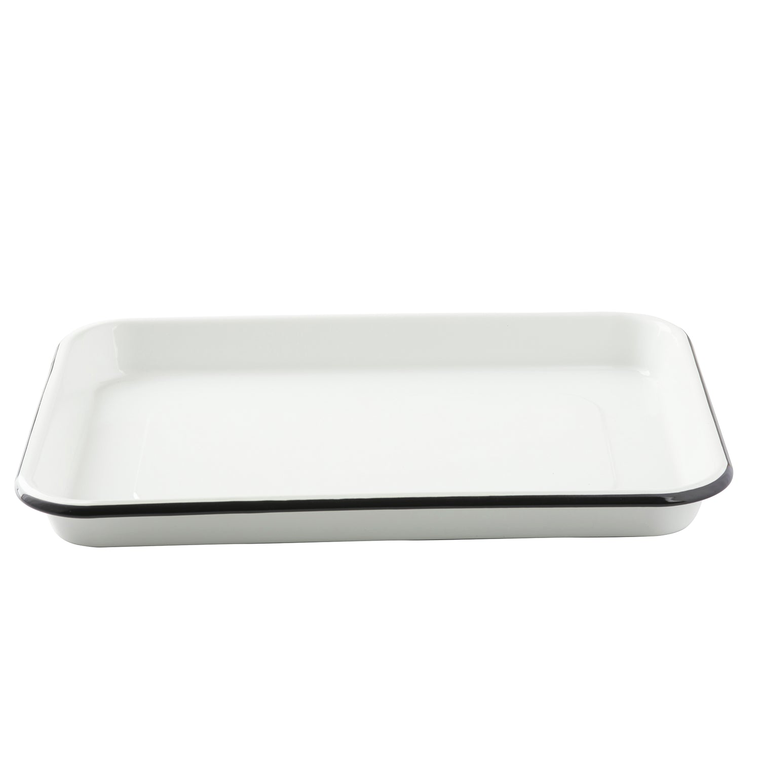 The Tablecraft 10347 Sheet Pan is a commercial-grade, quarter-size baking and roasting pan designed for high-volume foodservice operations. Measuring 13" x 9-1/2" with a height of 1-1/8", this enamel-coated, white pan with a black rim provides durable, uniform heat distribution for prepared foods. Its coated glazed finish ensures resistance to staining and ease of cleaning, making it suitable for fast-paced kitchen environments. Ideal for baking, roasting, and food prep tasks in bakeries, catering kitchens, and institutional cafeterias, this pan meets precise technical specifications for consistent performance in professional settings.