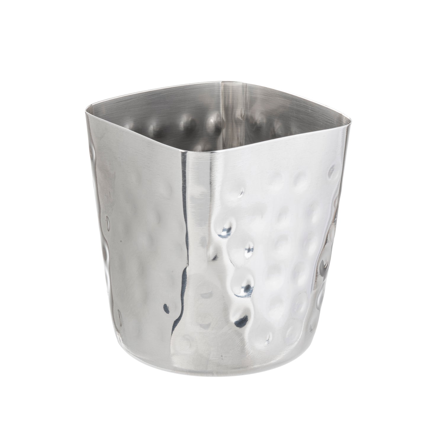 The Tablecraft 10678 Fry Cup is a professionally designed beverage container tailored for high-volume foodservice operations. Constructed from durable stainless steel with a hammered finish, this 13 oz. fry cup measures 3-1/8" x 3-1/8" x 3-3/8", making it ideal for serving fries or similar snack portions in commercial kitchens, casual dining settings, and concession stands. Its precise dimensions and sturdy material selection support repetitive use and easy cleaning, ensuring efficient workflow in fast-paced environments. This fry cup's technical specifications include a stainless steel construction with a hammered surface, offering both aesthetic appeal and resilience, suitable for countertop or tray service in restaurant or catering setups.