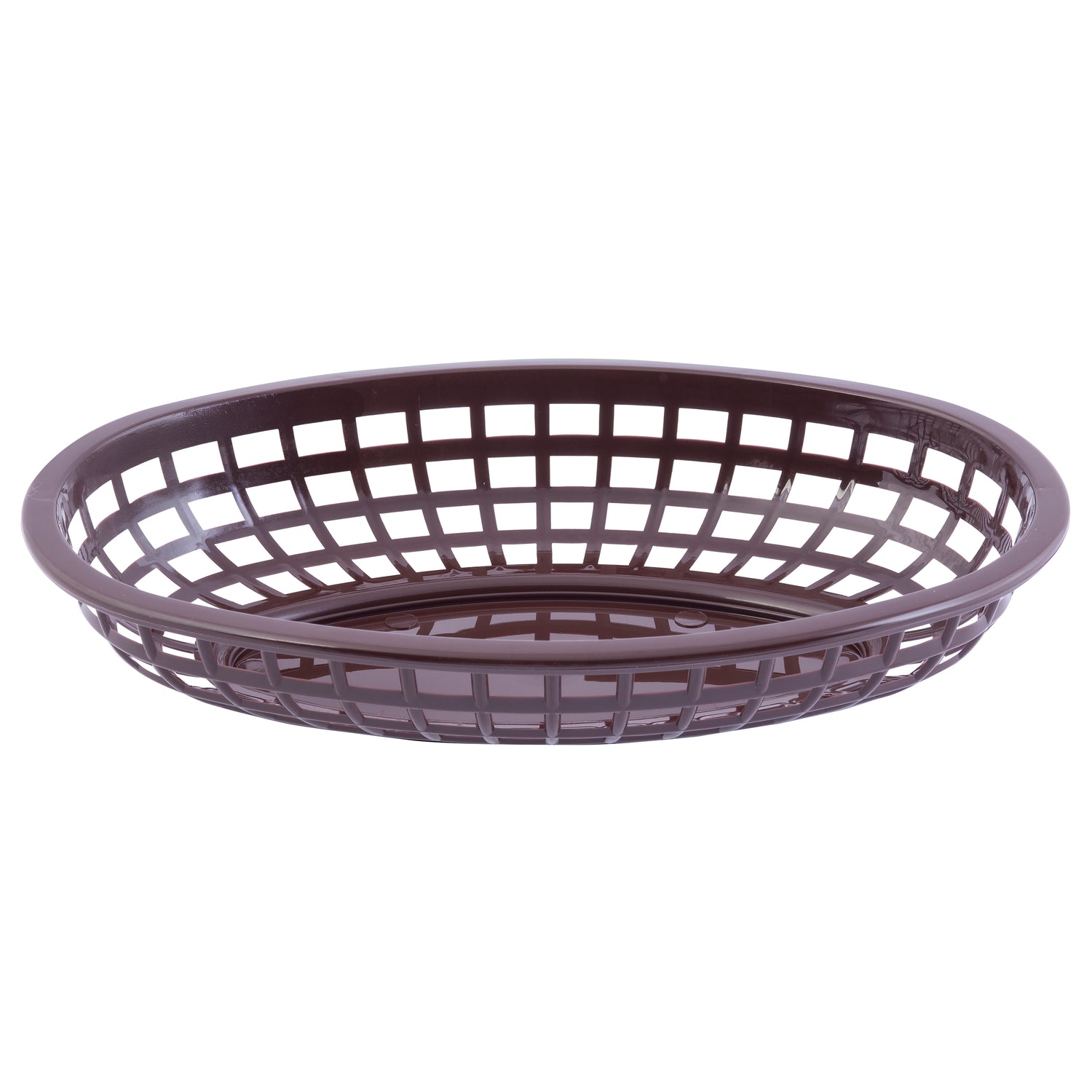 The Tablecraft 1074BR Classic Basket 9-3/8" x 6-1/4" x 1-7/8" oval is a durable, foodservice-grade container designed for fast food establishments and retail presentation. Crafted from polyethylene, this basket features an oval shape with precise dimensions of 9-3/8" length, 6-1/4" width, and 1-7/8" height. Engineered for heat resistance up to 150°F (65°C), it is suitable for heat lamp, microwave, and dishwasher applications, making it ideal for serving pre-packaged snacks, bread, or side items in commercial settings. Made in the USA, this basket combines practical functionality with robust construction, facilitating efficient workflow and maintaining product presentation standards in fast-paced foodservice operations.