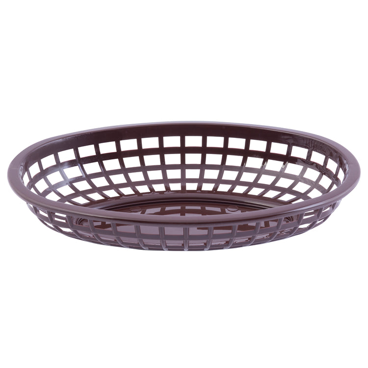 A brown, oval-shaped Classic Basket with an open grid design. The smooth rim and heat resistant plastic make it ideal for serving food like bread or fries. The empty basket reveals the white background behind it.