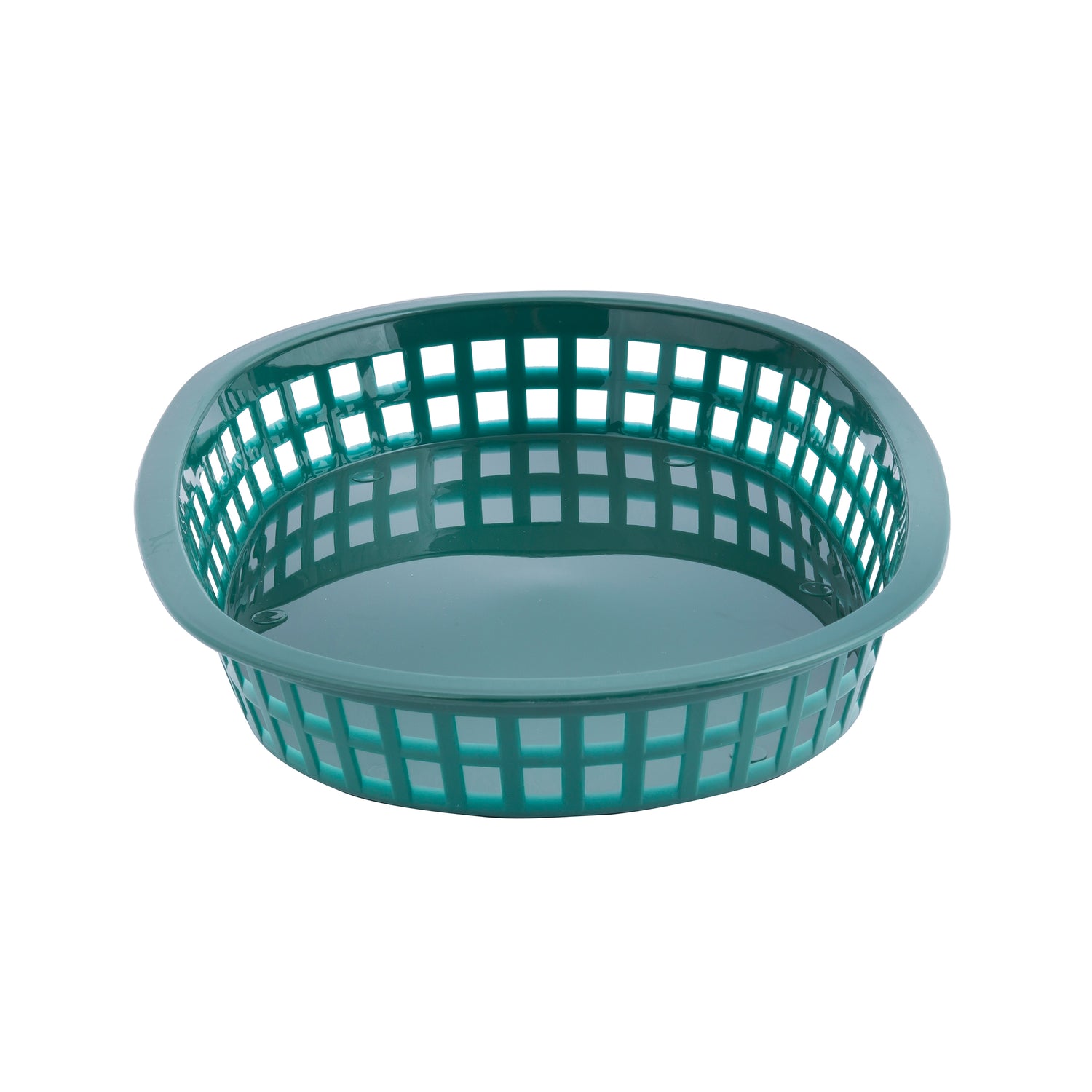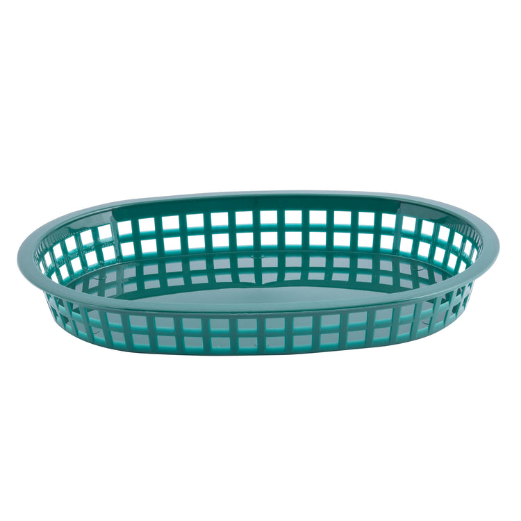 A teal plastic oval Chicago Platter Basket with a grid-like, open-weave design around the sides and a solid base. The basket is empty and pictured against a white background. Dishwasher safe for easy cleaning.