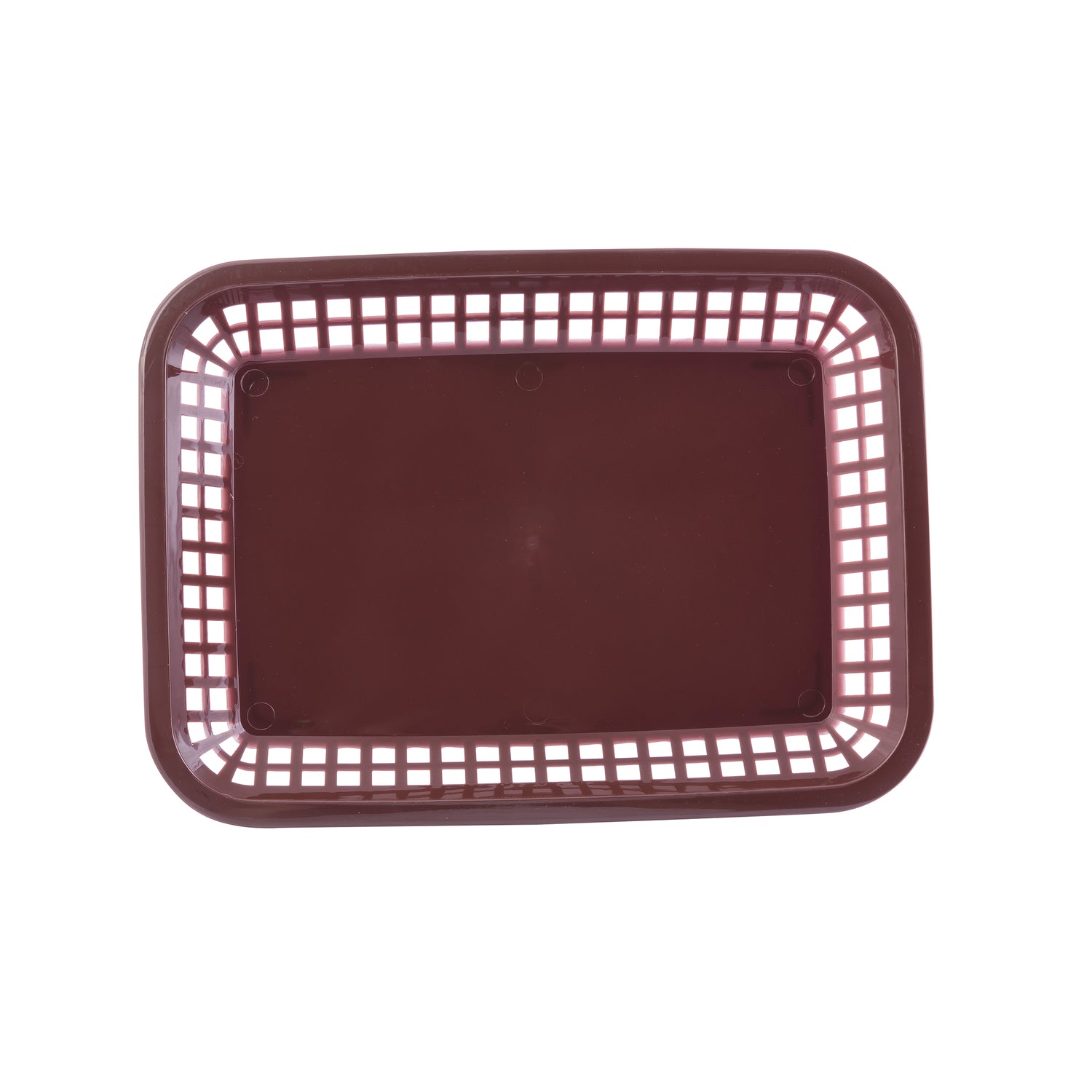 A commercial basket is a durable, food-safe container designed for food presentation and serving in professional foodservice environments. The Tablecraft 1077BR is a rectangular polypropylene basket tailored for fast-food and casual dining settings. It features a 10-3/4" x 7-3/4" size with heat resistance up to 150°F/65°C, facilitating use in heated display or holding scenarios. Its microwave and dishwasher compatibility ensures efficient operation, making it suitable for high-volume foodservice applications such as fast-food outlets and snack bars where presentation and quick turnaround are essential.