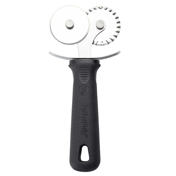 A Double Pastry Cutter with stainless steel dual blades and a black ergonomic PerfectGrip handle. One blade is smooth and circular, the other serrated. Photographed on a white background, "PerfectGrip" is embossed on the handle.