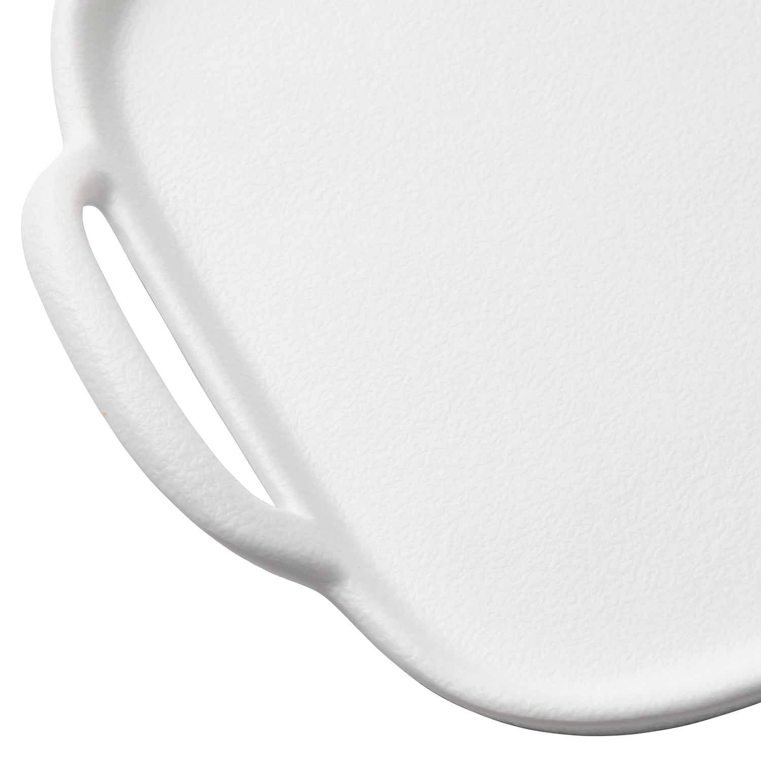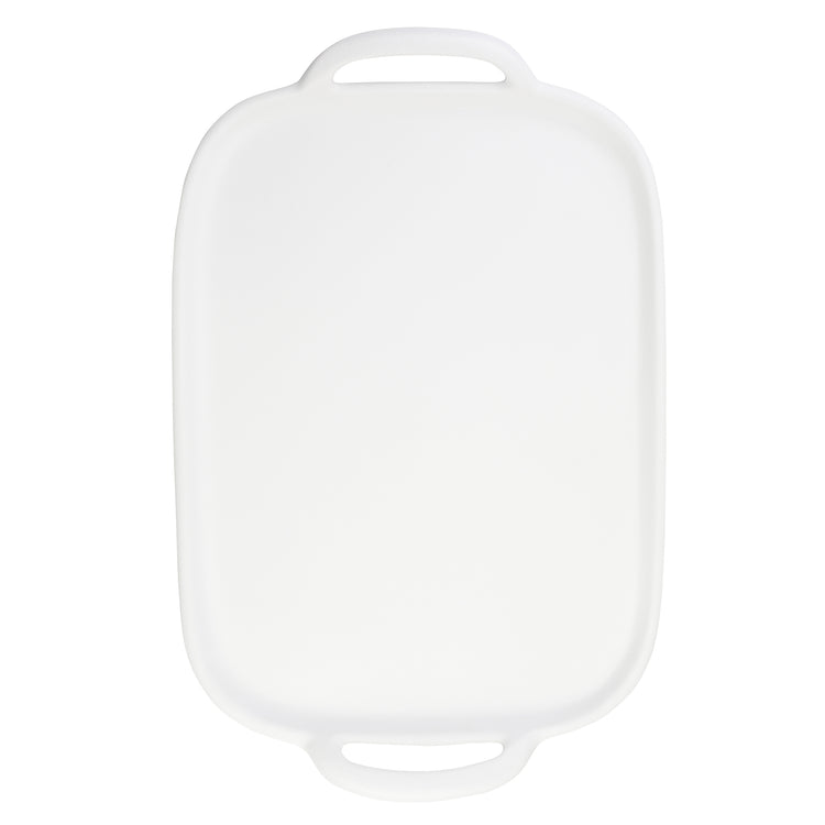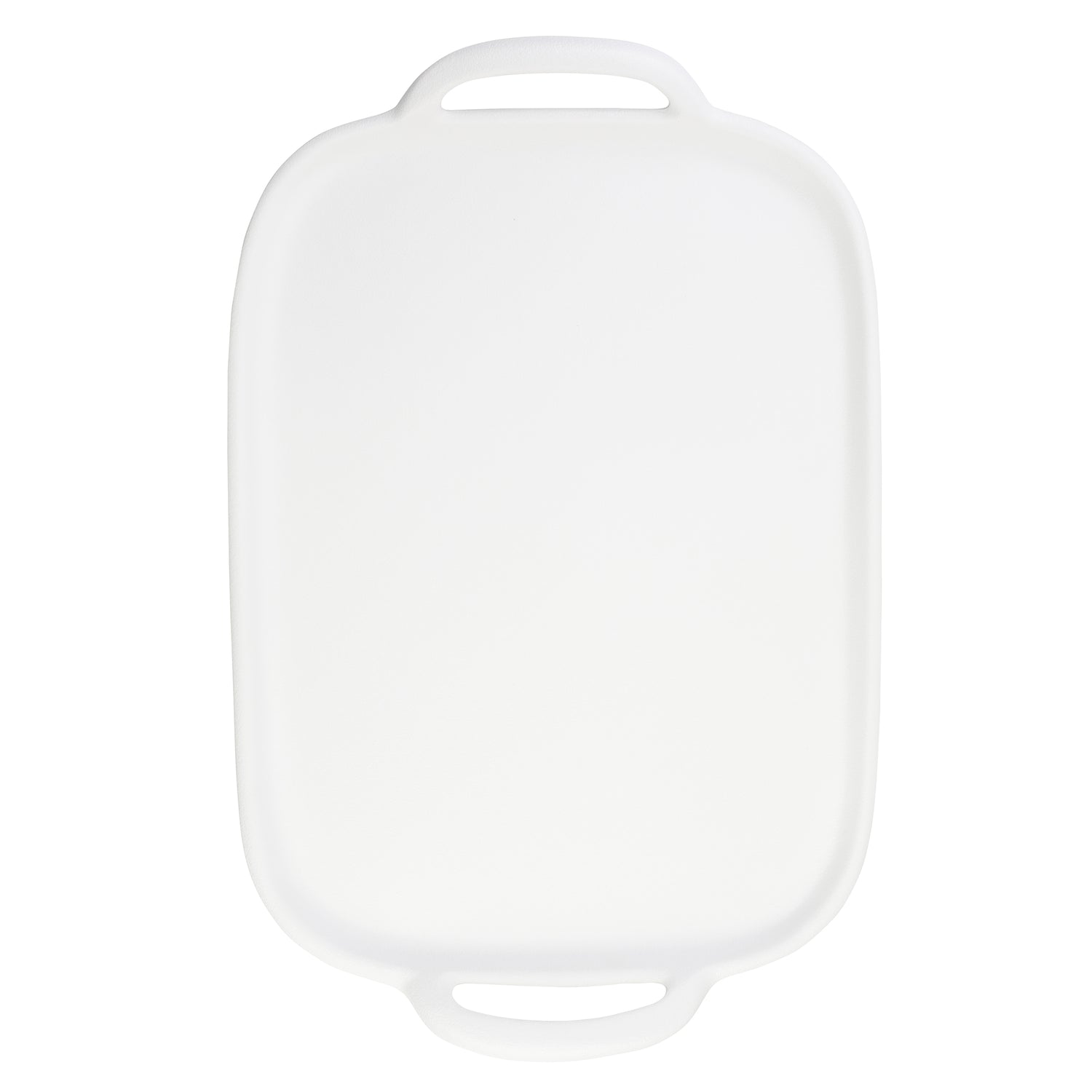 A large, rectangular white plastic cutting board with rounded edges and two oval handles on opposite ends. Made from durable melamine, its smooth surface is unmarked and set against a plain white background.
