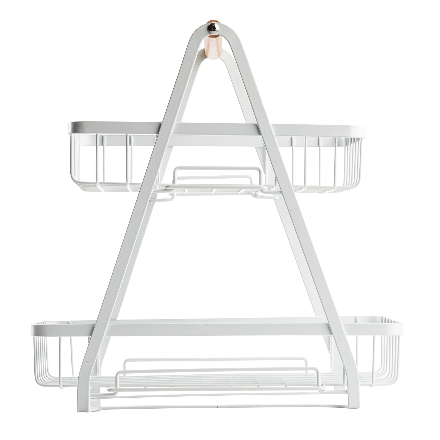 The Tablecraft 11784 Display Basket is a commercial-grade two-tier storage and presentation solution designed for foodservice environments requiring efficient product display and organization. Crafted from powder coated steel with wooden handles, this white display stand measures 11-7/8 inches wide, 9-1/8 inches deep, and 12-1/4 inches high, making it suitable for countertop use in retail, catering, and hospitality settings. Its durable construction and balanced design optimize visual merchandising and airflow, supporting high-volume food presentation and product accessibility without compromising stability or sanitation standards.