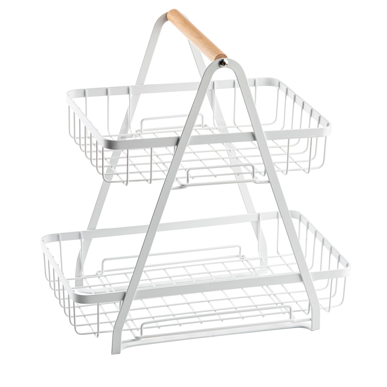 The Tablecraft 11784 display basket features a sturdy powder coated steel frame with a classic white finish, combining durability with aesthetic appeal for professional foodservice displays. Its (2) tier design facilitates clear product separation and efficient organization in counters or display areas. Timber handles enable easy repositioning and handling, while the compact footprint supports versatile placement in various kitchen or retail setups. The technical construction supports high traffic environments, ensuring long-lasting performance with minimal maintenance.