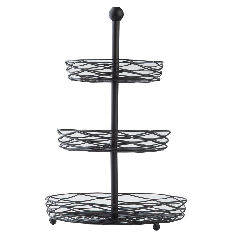 This versatile three-tier display basket is engineered for professional foodservice use, offering efficient space management and stability for showcasing baked goods, produce, or snacks. Its steel construction ensures longevity during frequent handling, while the black powder-coated finish withstands cleaning routines common in commercial kitchens. Designed for countertop placement, it streamlines workflow by providing accessible, organized product presentation tailored for moderate throughput operations in cafes, cafeterias, or bakeries.