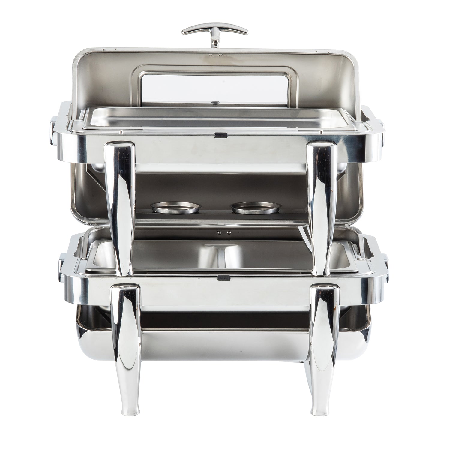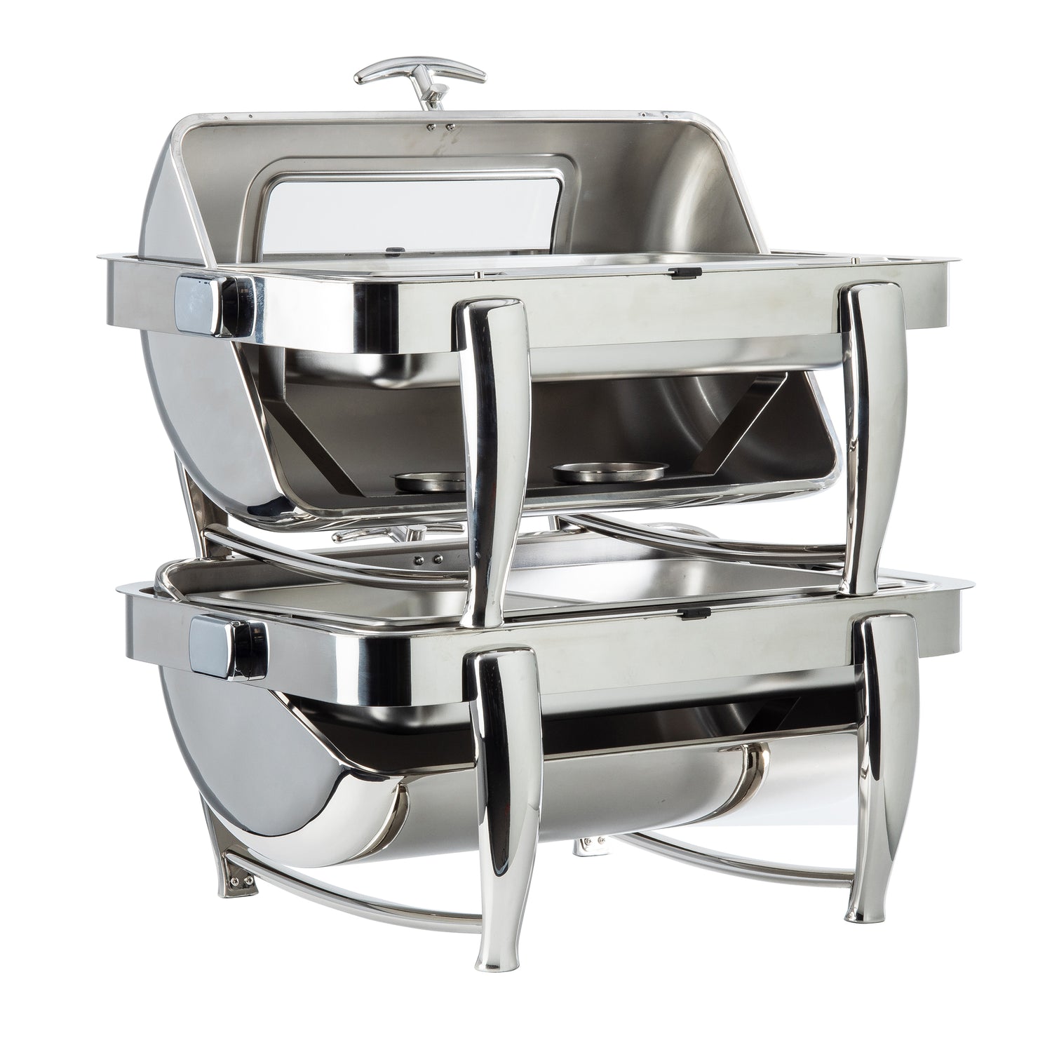 This dripless roll top chafer with window supports efficient food presentation and service, featuring a 9 qt. capacity, stackable structure, and materials optimized for commercial durability. Its stainless steel frame ensures longevity, while the glass window provides clear visibility of food contents. Designed for easy cleaning and maintenance, it integrates seamlessly into banquet and catering workflows, reducing service interruptions and promoting efficient workflow in high-traffic foodservice operations.