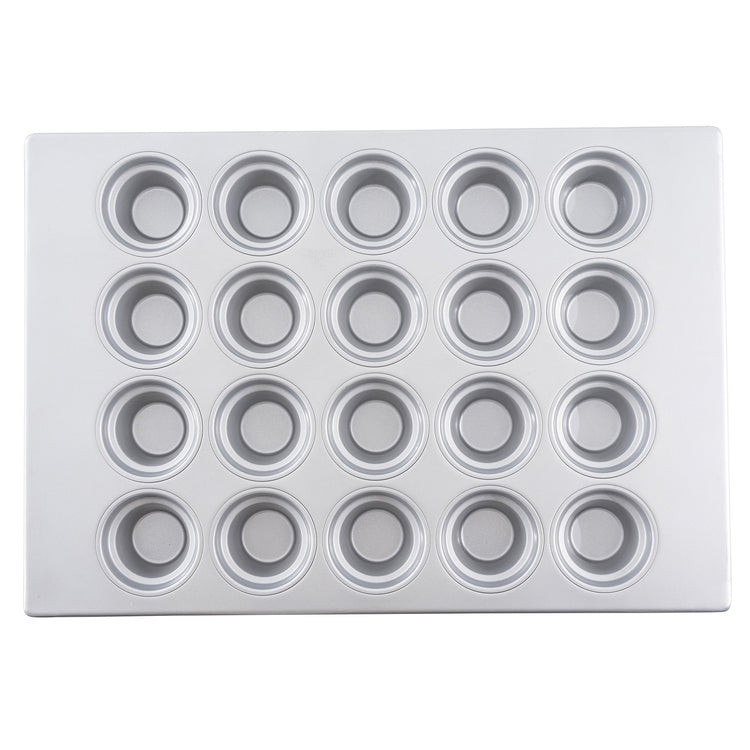 A silver metal muffin or cupcake pan is shown from above, featuring 24 round, evenly spaced cups arranged in a 4 by 6 grid. This silicone glazed non-stick pan has a smooth, shiny finish with slightly raised edges around each cup.