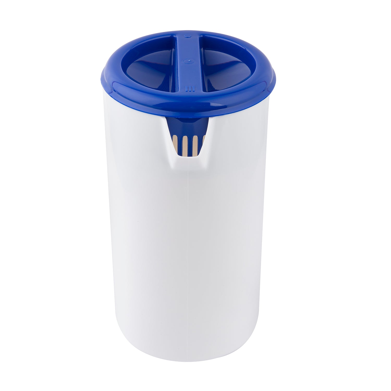 A tall, BPA free white plastic pitcher with a large handle and blue lid. The lid has grooves and fits snugly on top. There is a spout for easy pouring and a barcode sticker near the bottom. This pitcher is also dishwasher safe.
