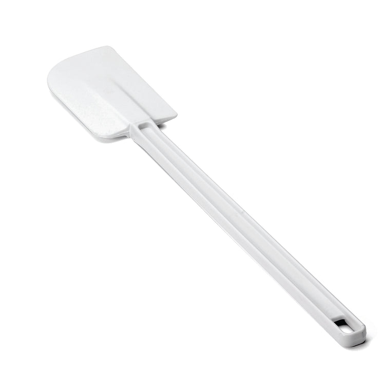 A BPA free, heat resistant white plastic spatula with a long handle and a flat, rectangular, slightly curved blade, positioned diagonally on a white background. The handle has a small hole at the end for hanging.