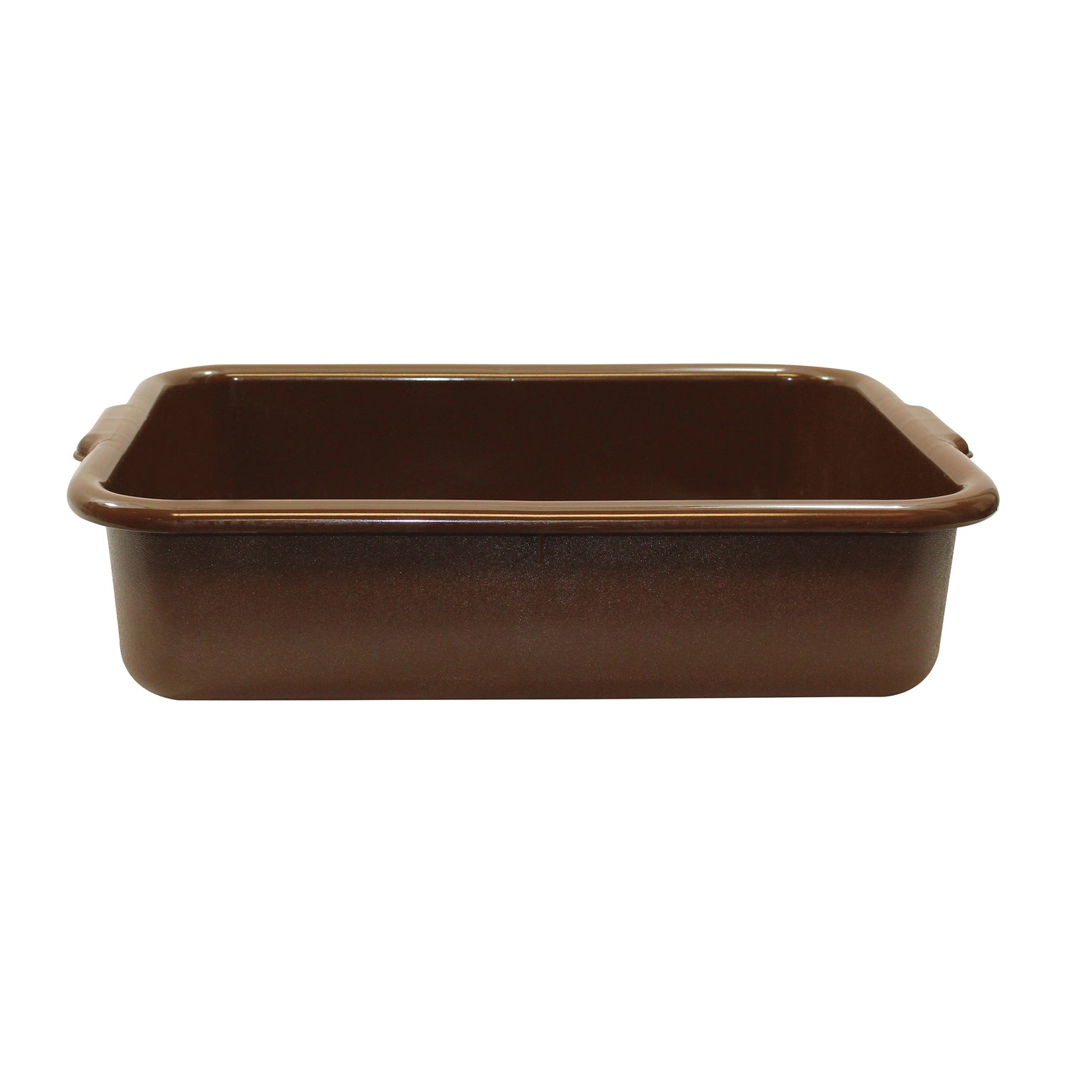 A commercial bus box is a large, durable plastic container designed for storage, organization, and transportation within foodservice operations. It is typically made from impact-resistant polyethylene, offering high durability and ease of cleaning. The Tablecraft 1529BR tote box, with its 21-1/2" x 15-3/4" x 5" dimensions and stackable, dishwasher-safe features, is ideal for bulk handling in catering, warehousing, and kitchen workflow management, supporting moderate throughput in professional foodservice environments.