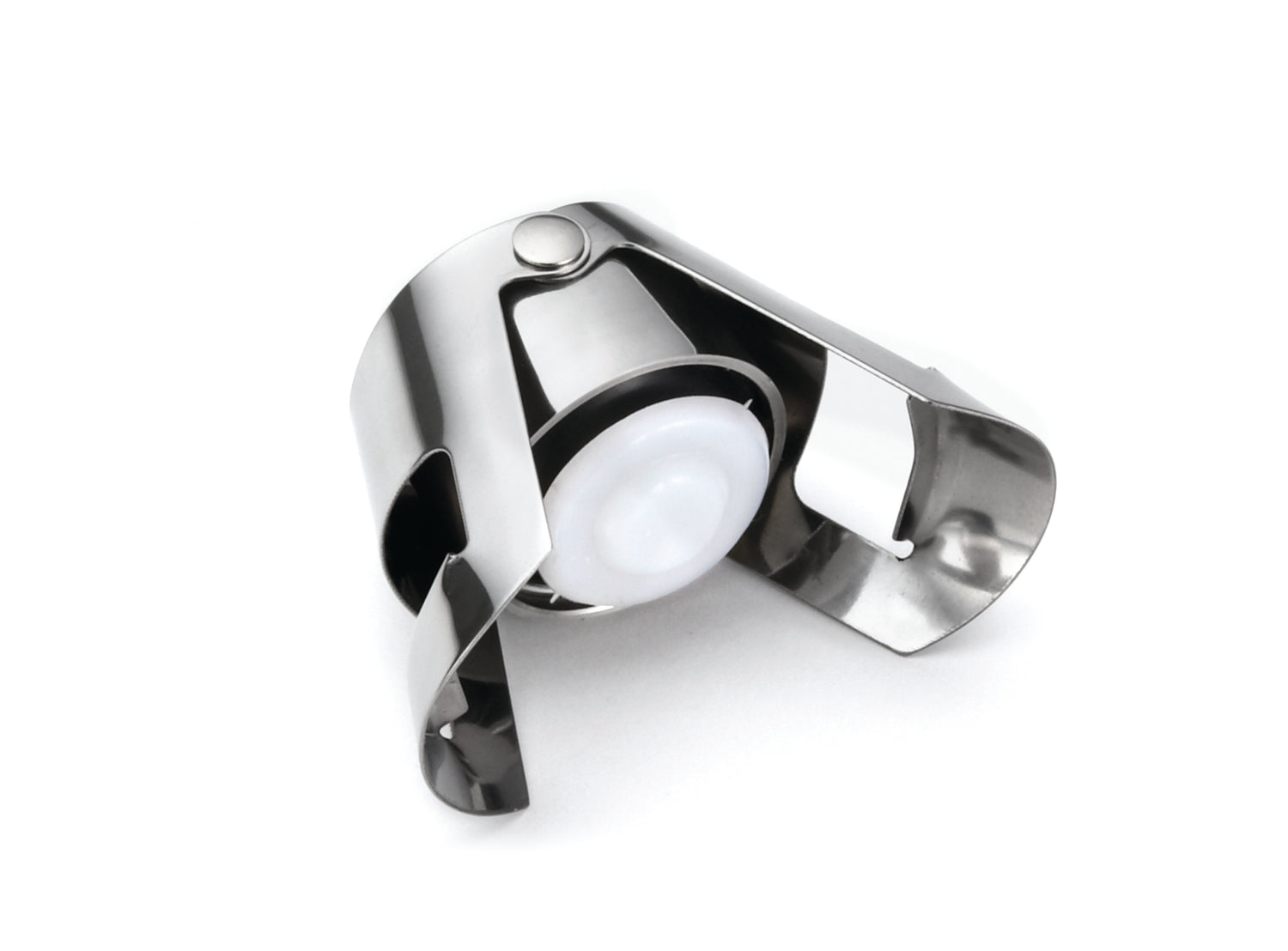 A sleek, durable Champagne Bottle Sealer made of stainless steel with a white plastic seal is shown against a white background. Its hinged arms grip the bottle neck securely and the stopper is dishwasher safe for easy cleaning.