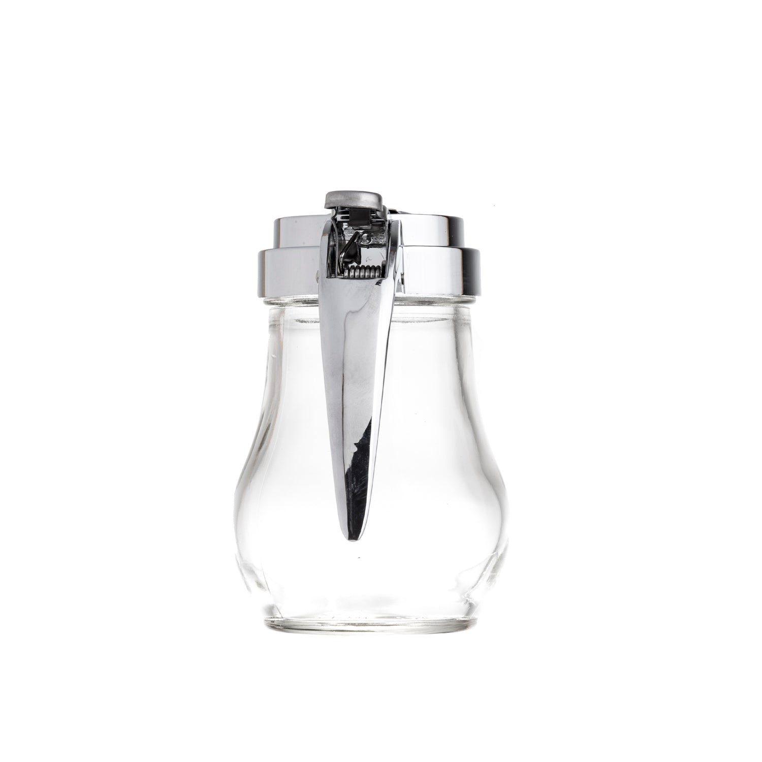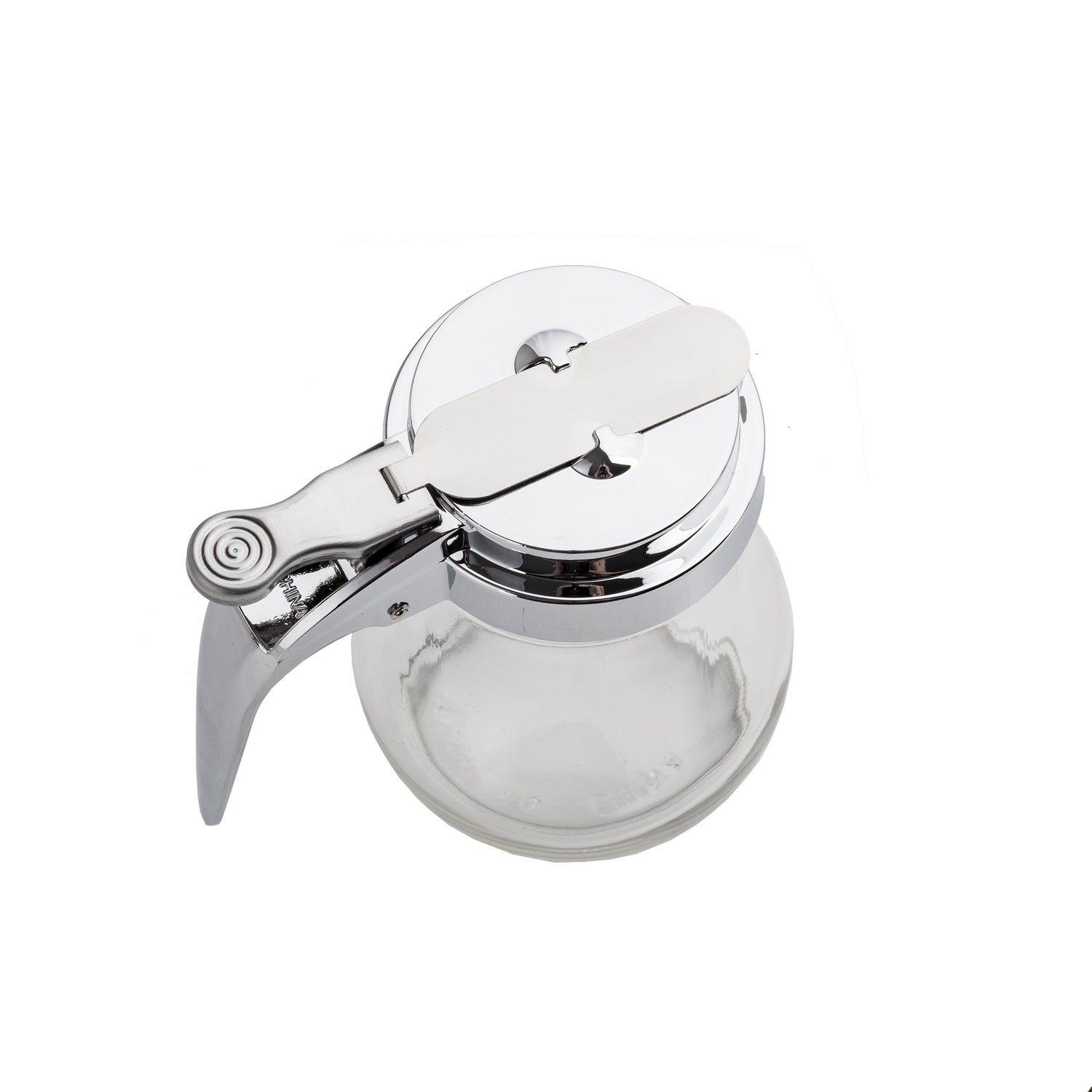 A commercial syrup pourer is a specialized condiment dispensing device used in foodservice environments such as cafeterias, buffets, or beverage stations for accurate portioning and hygienic service. The Tablecraft 406BK is an all-glass syrup dispenser with a 6 oz. capacity, designed for reliable repeated use and easy cleaning in professional kitchens. Installed directly on countertops or racks, it serves as an efficient solution to control portions and maintain cleanliness in high-traffic settings, making it ideal for mid-volume or bulk condiment management in busy foodservice operations.
