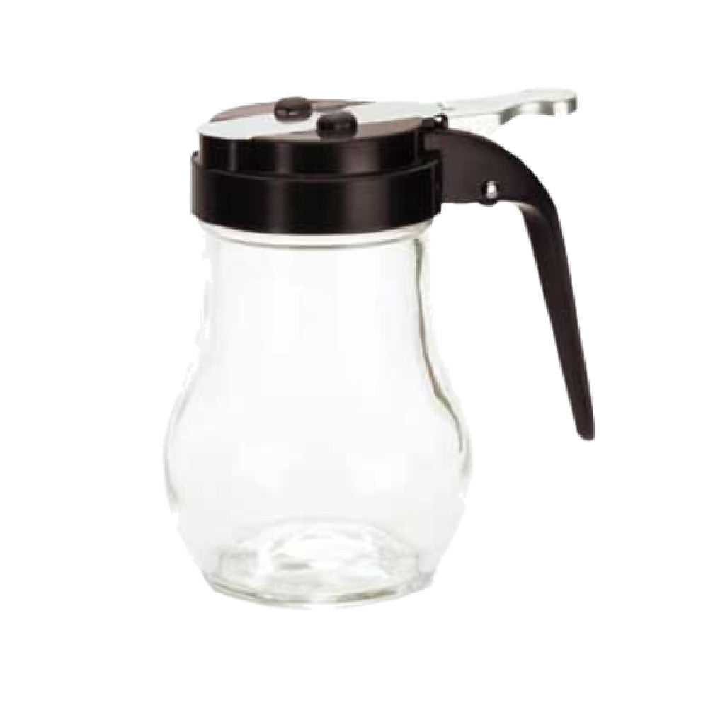 A commercial syrup pourer is a specialized condiment dispensing device used in foodservice environments such as cafeterias, buffets, or beverage stations for accurate portioning and hygienic service. The Tablecraft 406BK is an all-glass syrup dispenser with a 6 oz. capacity, designed for reliable repeated use and easy cleaning in professional kitchens. Installed directly on countertops or racks, it serves as an efficient solution to control portions and maintain cleanliness in high-traffic settings, making it ideal for mid-volume or bulk condiment management in busy foodservice operations.