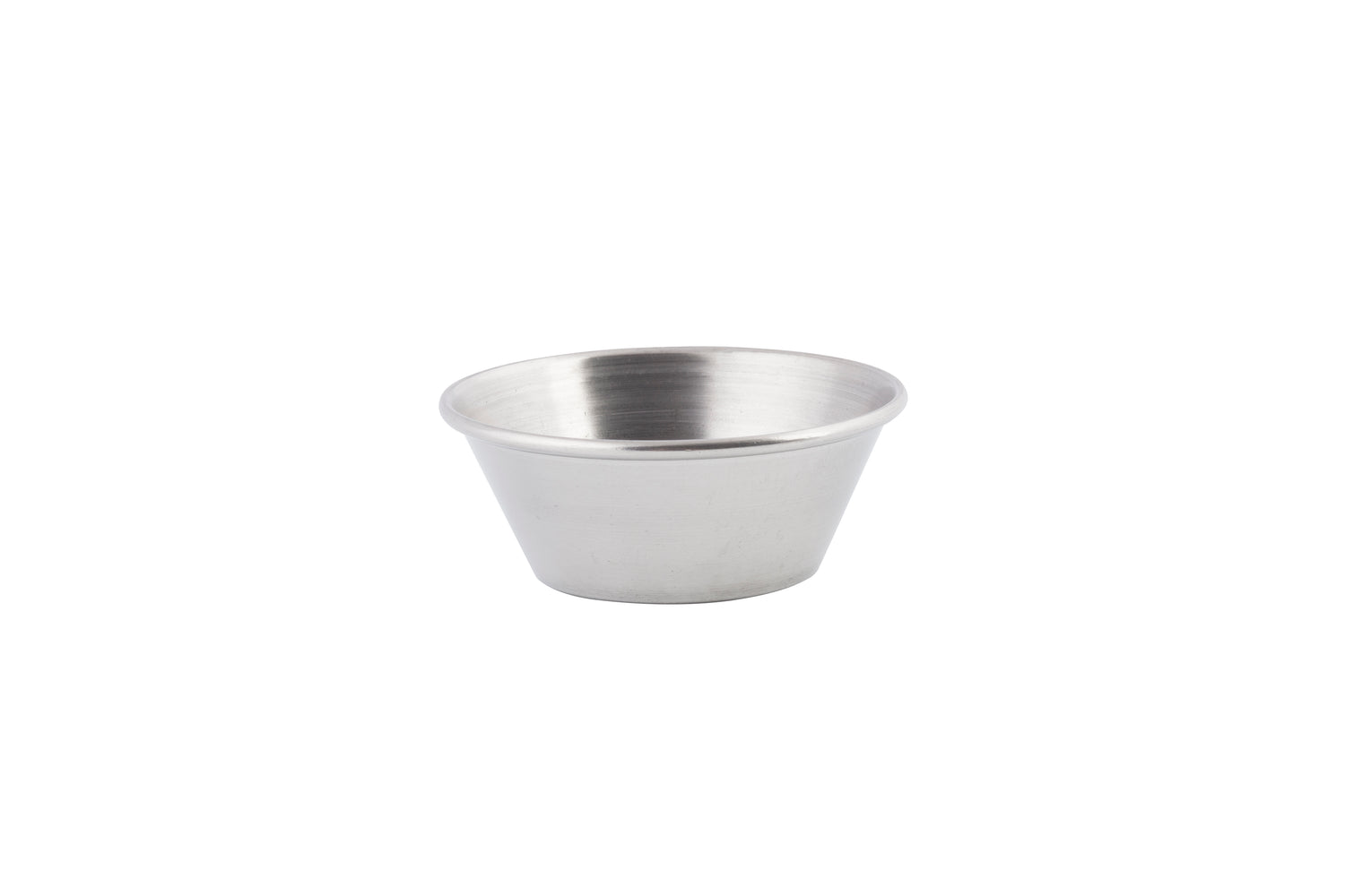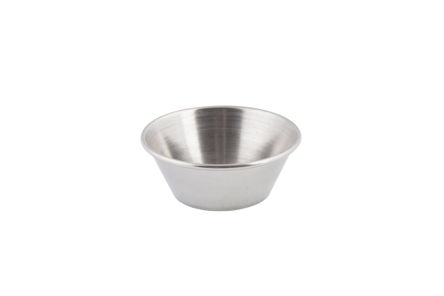 A small, empty stainless steel sauce cup with a shiny silver finish sits centered on a plain white background. The cup has smooth sides that taper slightly toward the base and a rounded rim.