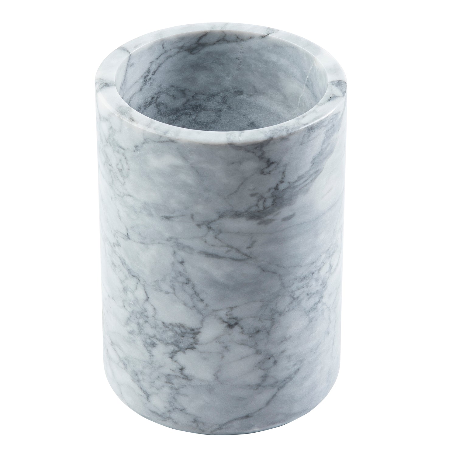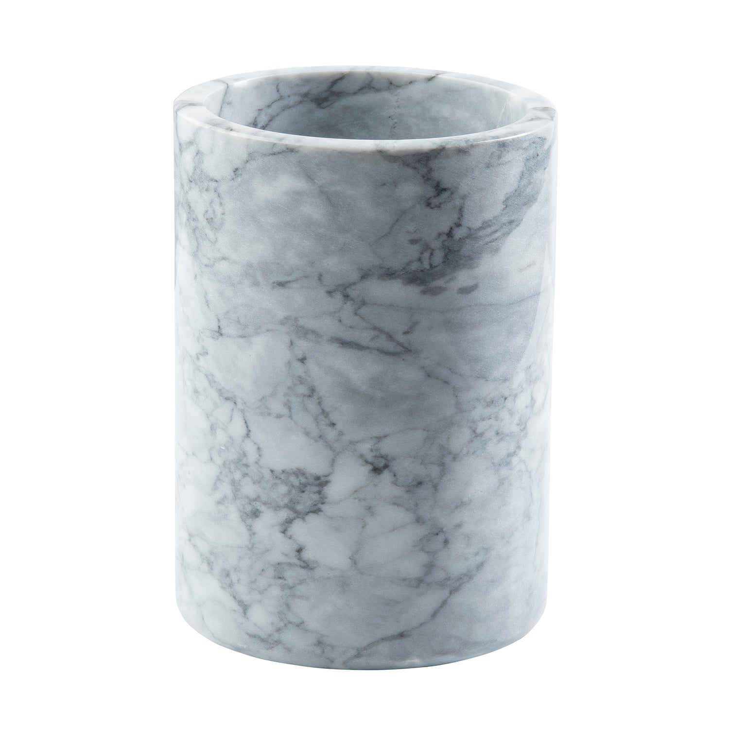 A cylindrical, white marble TableCraft utensil holder with gray veining, smooth polished surface, and an open top. The holder is empty and photographed against a white background.