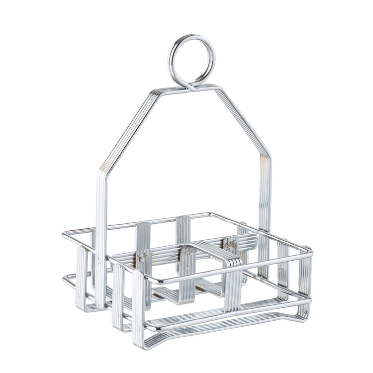 The Tablecraft 606R Condiment Rack is a commercial-grade foodservice accessory designed for efficient organization of salt, pepper, and sugar packets in busy hospitality environments. Measuring 6" x 4-1/4" x 4", this chrome-plated metal condiment caddy offers durable construction suitable for high-traffic applications. It features three compartments with a built-in merchandising ring, accommodating up to two 1-5/8" diameter salt and pepper shakers and sugar packets, streamlining condiment presentation and access. This rack is optimized for moderate workflow foodservice settings requiring reliable, easy-to-clean condiments organization.