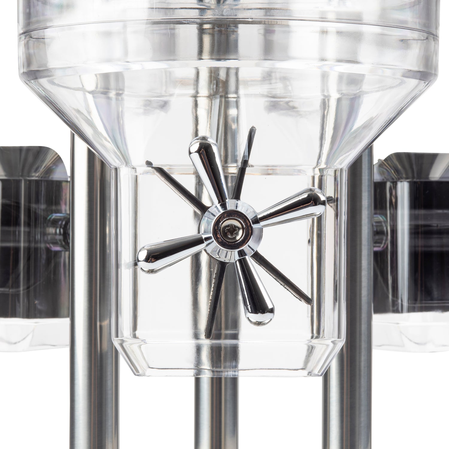The Tablecraft 693 triple cereal dispenser operates with a standard countertop setup, featuring a stainless steel base that provides stability and corrosion resistance. It is constructed primarily from polycarbonate for transparent product chambers, allowing quick stock assessment. The dispenser measures 19-1/2" x 19-1/2" x 26-1/2" and weighs approximately 31.58 lbs, facilitating straightforward placement and handling. The design includes dishwasher-safe components, supporting efficient sanitation protocols. With no electrical requirements, it relies on manual operation, making it suitable for locations with limited electrical access or preference for manual equipment. Its durable materials and precise portioning mechanisms support consistent service in moderate throughput foodservice operations.