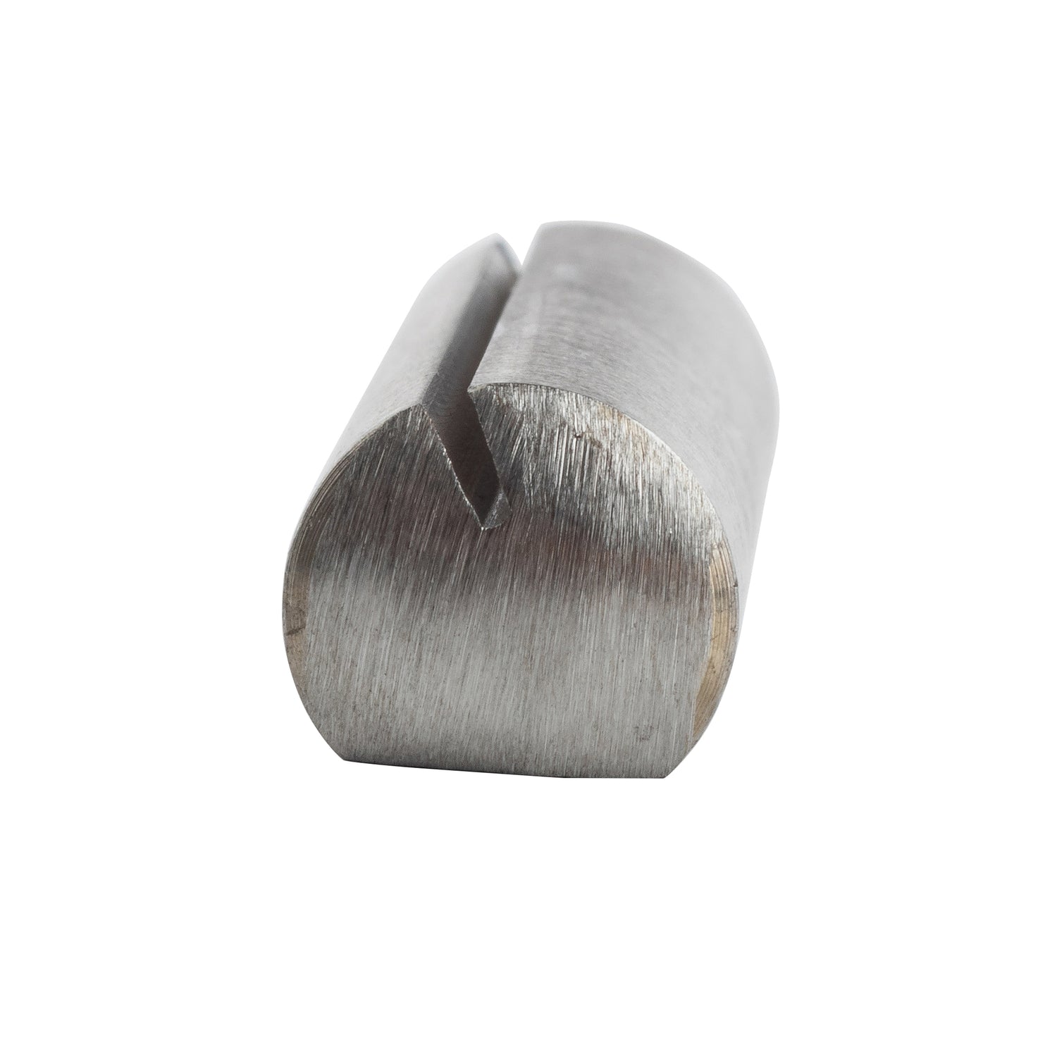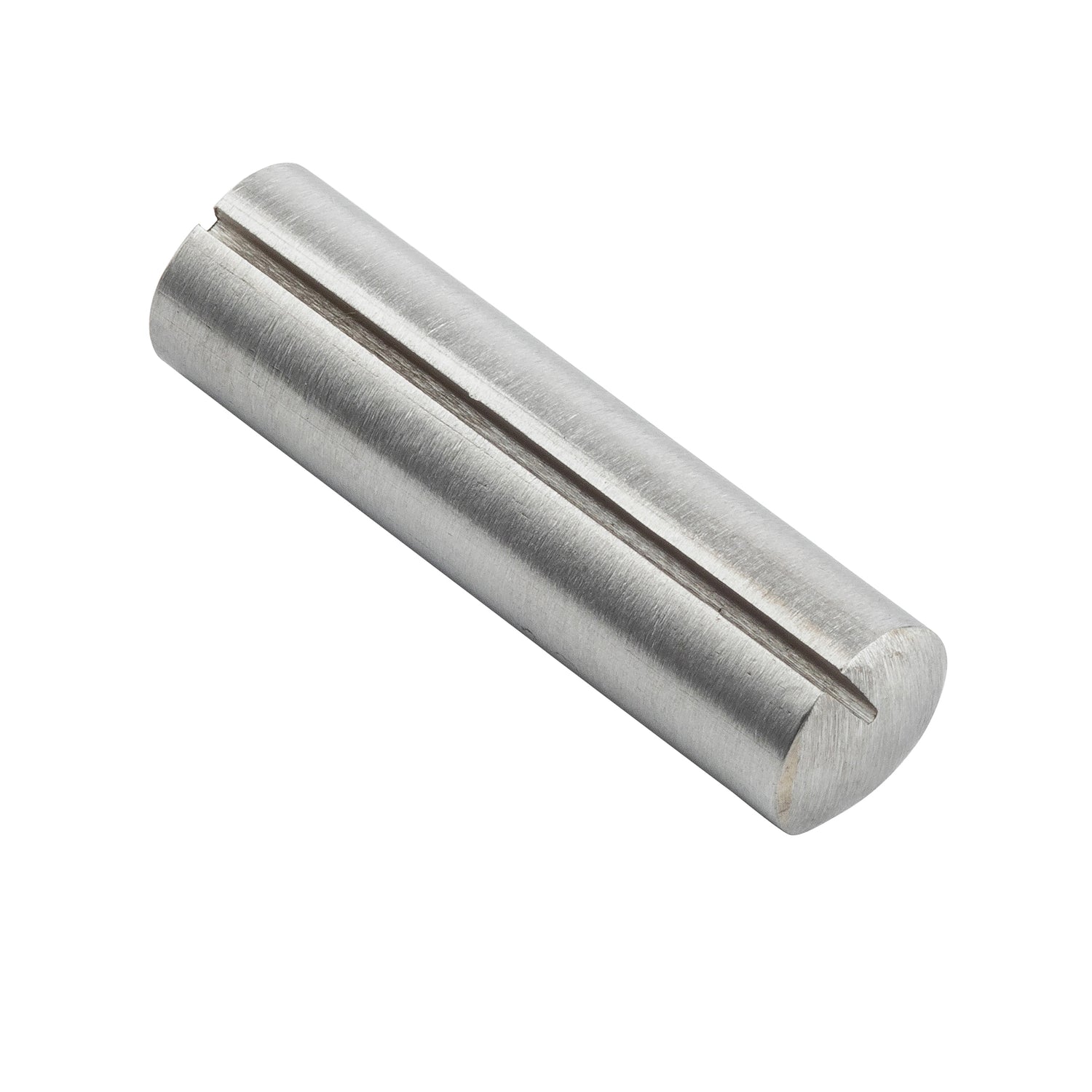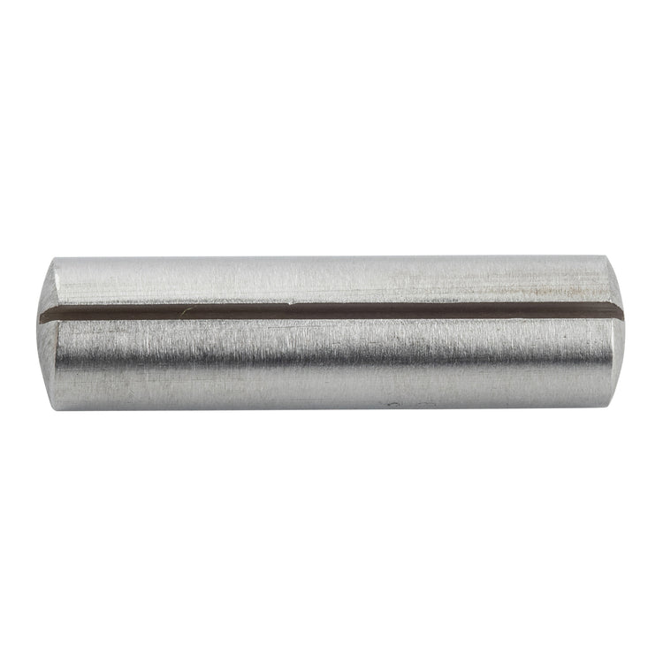 A cylindrical stainless steel dowel pin with a visible lengthwise groove along its smooth, shiny surface. The chamfered ends enhance its sleek look as it rests horizontally against a white background.
