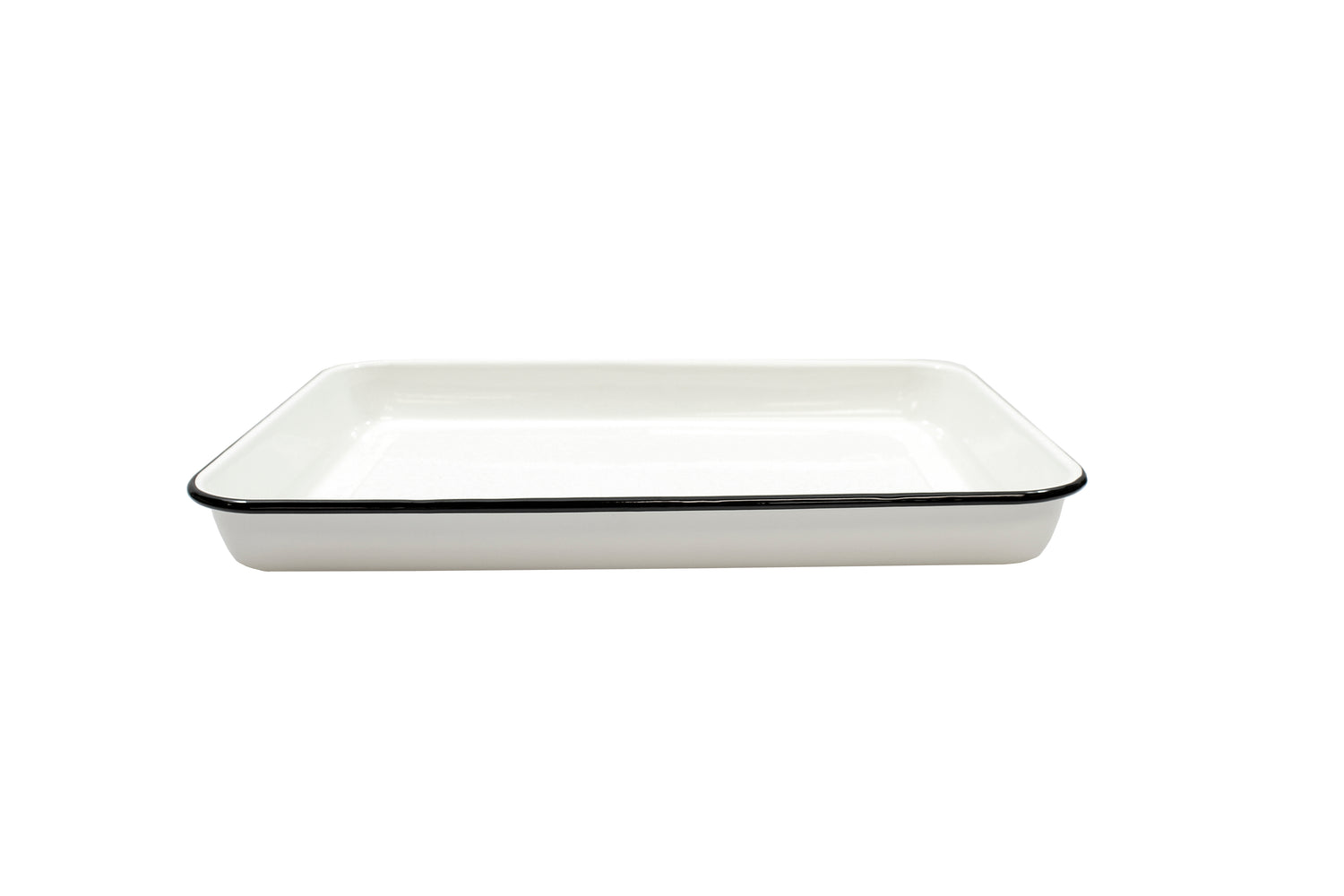 The Tablecraft 80012 Enamelware Collection™ Serving Tray is a durable, professional-grade foodservice accessory designed for rectangular presentation of food, beverages, or display items. Crafted from vitreous porcelain enamel coated steel, this 16" x 11-1/2" x 1-1/2" tray offers chemical and impact resistance suitable for busy commercial kitchen environments. Its classic creamy white finish with a black rim enhances visual appeal while ensuring long-term usability and simple maintenance, making it ideal for high-traffic catering, buffet lines, or restaurant display applications.