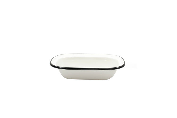 The Tablecraft 80013 Enamelware Collection™ Serving Pan is a durable, professional-grade foodservice utensil designed for versatile presentation and serving applications. Crafted from vitreous porcelain enamel coated steel, this rectangular serving pan features a 7-3/4" x 5-3/4" x 1-3/4" dimension, providing an 18 oz. capacity suitable for countertop display, ingredient meandering, or portioning in commercial kitchens. Its cream-colored finish with a black rim enhances visual appeal while facilitating easy cleaning and maintenance. This pan's dishwasher-safe design ensures operational efficiency in high-volume foodservice environments, making it optimal for buffet setups, catering services, and catering prep stations.