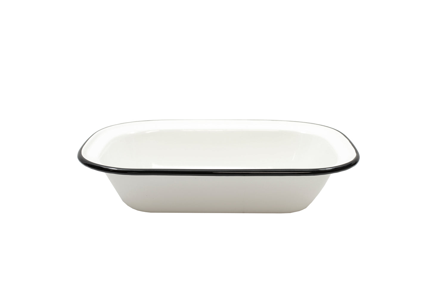 The Tablecraft 80015 Serving Pan combines a 40 oz. capacity with a durable porcelain enamel surface coated onto steel, supporting consistent usage in high-demand settings. Its dimensions of 11" x 8-1/8" x 2-3/8" facilitate efficient placement in standard foodservice stations. This pan is dishwasher safe, promoting quick turnaround and sanitation. Constructed with impact-resistant vitreous coating, it withstands frequent dishwashing and temperature fluctuations. Weighing approximately 1.19 lbs, it is lightweight yet robust, suitable for stacking with other trays for space optimization. Its white finish with a black rim provides a classic, professional appearance compatible with various service styles. Safe for standard commercial dishwasher cycles, the pan supports fast cleaning routines essential for continuous operation in busy environments. It is made from high-quality porcelain-coated steel, ensuring longevity and resistance to daily wear. The pan's operating temperature resistance extends up to typical foodservice temperatures, making it versatile across various serving applications.
