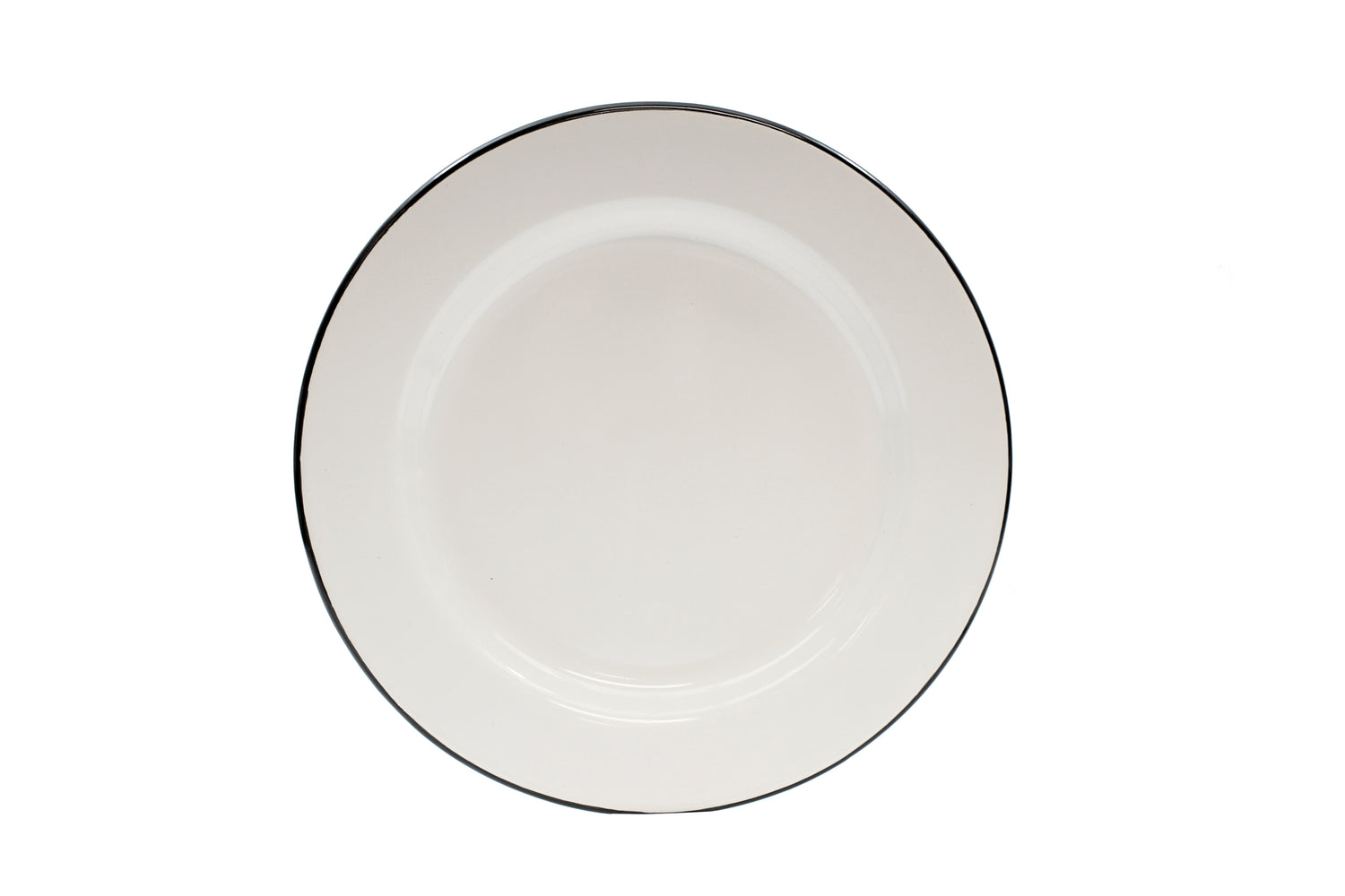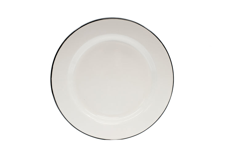 A plain white Enamelware plate with a thin black rim, viewed from above against a white background. The round, glossy plate features a simple, minimalistic design and is dishwasher safe for easy cleaning.