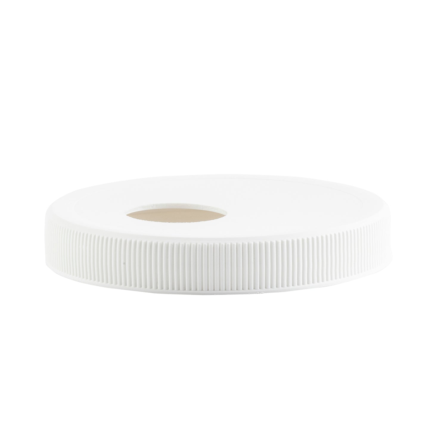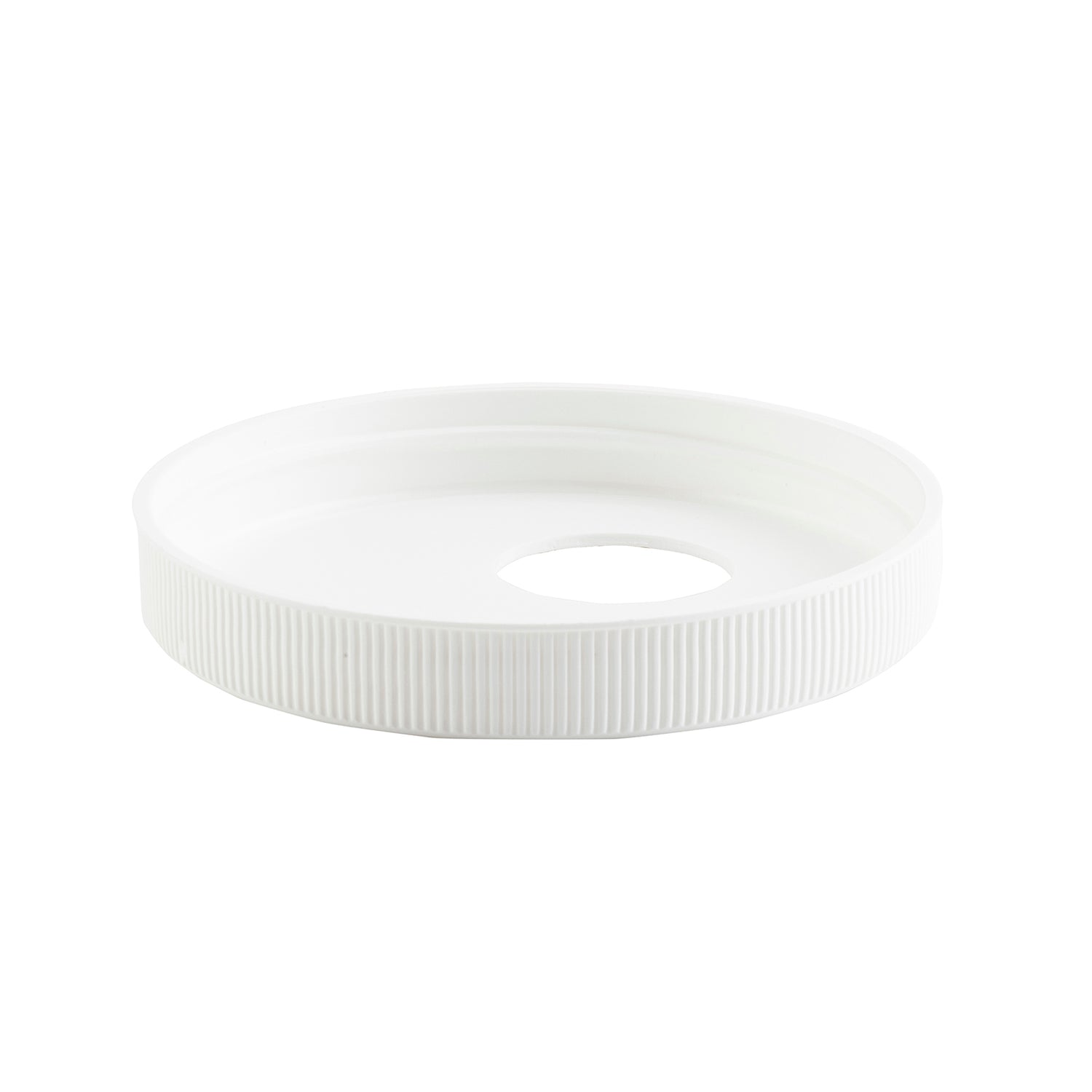 A white, round 89mm plastic lid with a centered circular hole, designed as a condiment pump cap. It features a ribbed edge for grip and a smooth top surface. The plain white background highlights the lid, which is also dishwasher safe.