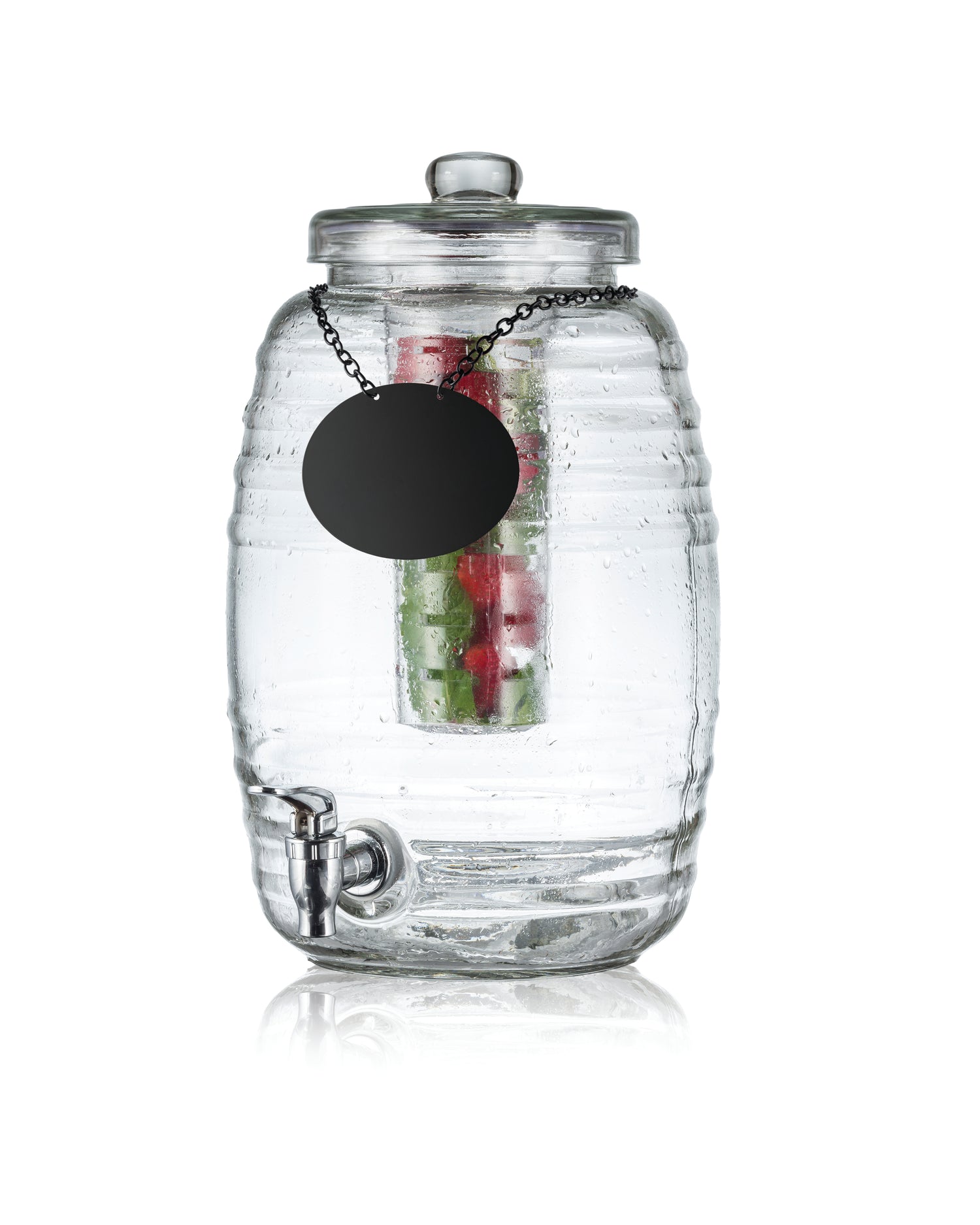 This commercial beverage dispenser combines a 2-1/2 gallon capacity with a sturdy glass construction and integrated ice core and infuser for efficient temperature control. Its slim profile facilitates countertop placement while enabling easy access for staff and guests. Designed for durability, it features a chalkboard necklace for labeling and is suitable for continuous operation in busy foodservice venues, supporting efficient beverage flow and simplified replenishment practices.