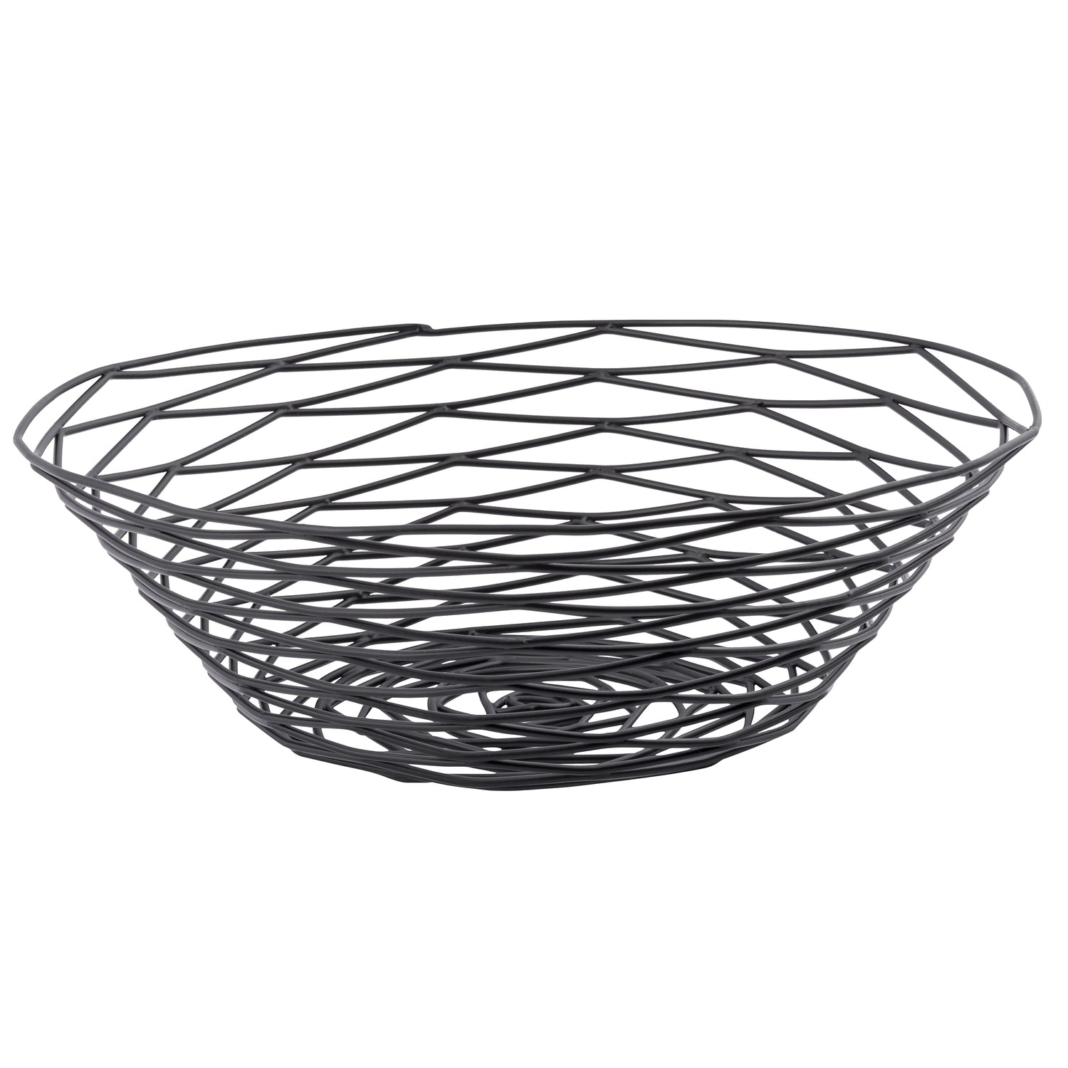 A round, black powder coated metal basket from the Artisan Collection Basket line by TableCraft features an open, crisscross pattern and a wide rim tapering to a smaller base. The plain white background highlights the basket’s elegant, shallow bowl shape.