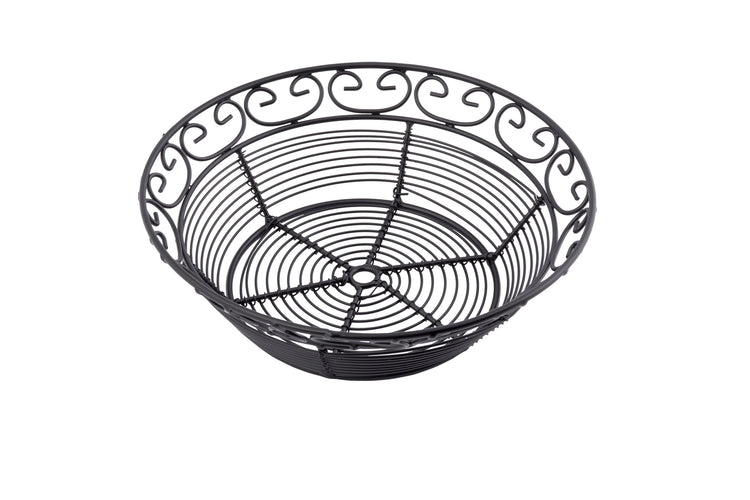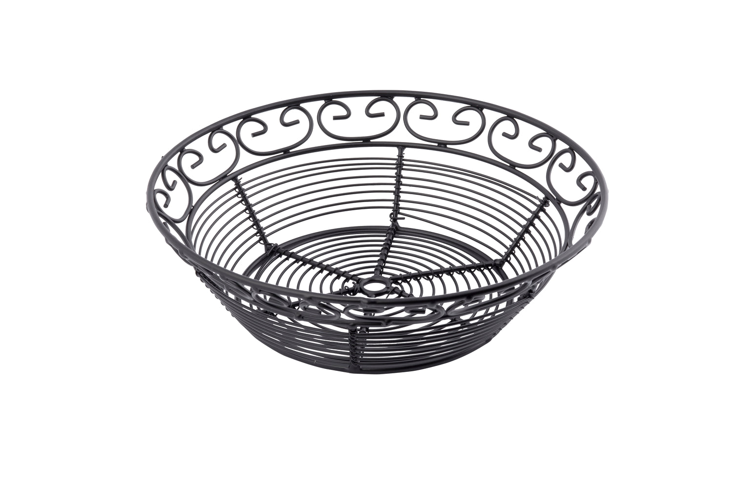 The Tablecraft BK27508 basket is built from metal with a black powder-coated finish that resists corrosion and daily wear. Its dimensions include an 8-inch diameter and a height of 2-1/4 inches, with a weight of approximately 0.79 lbs, facilitating ease of handling and placement across various service setups. The basket is designed for hand wash cleaning, supporting quick turnaround in fast-paced foodservice settings. Operating within standard kitchen environments, it handles typical ambient temperatures and is compatible with common display arrangements. Its construction emphasizes durability and presentation, making it suitable for countertop applications where presentation quality and ease of maintenance are priorities.