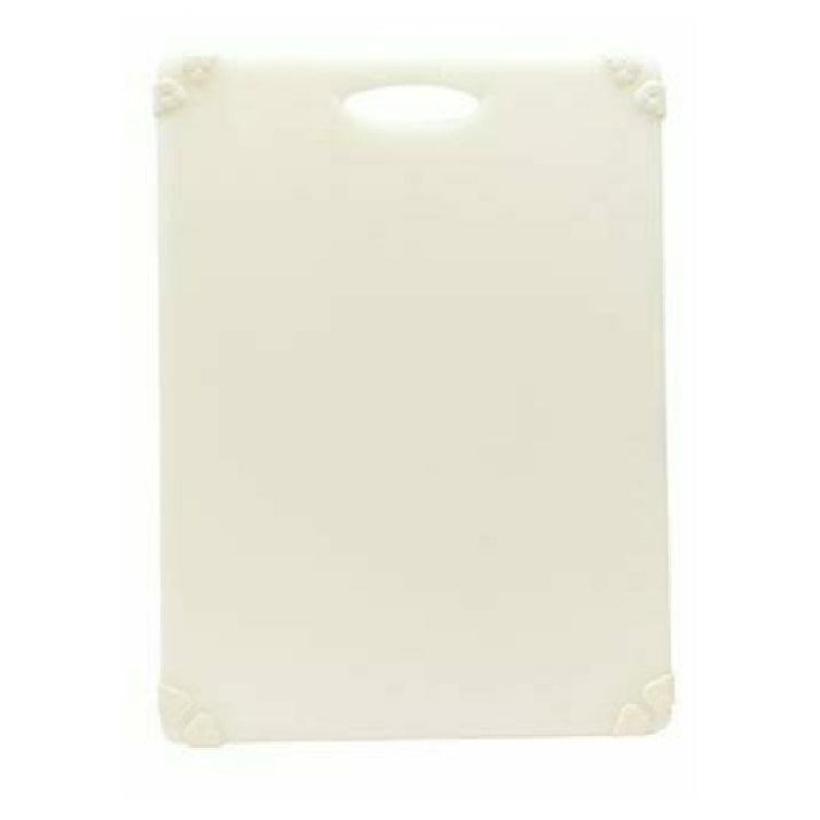 The Tablecraft CBG1520AWH Cash & Carry Grippy Cutting Board is a commercial-grade plastic cutting surface designed for professional kitchens. Measuring 15" x 20" with a 1/2" thickness, this foodservice essential features integrated handles for ease of maneuvering and anti-slip grips to prevent movement during use. Constructed from durable, heat, chemical, and warp resistant plastic, it ensures reliable performance in high-volume food preparation environments. This cutting board's robust design and dishwasher-safe construction make it an ideal choice for busy culinary operations requiring consistent hygiene and rapid turnaround.