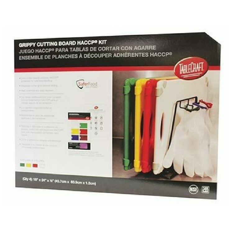 The Tablecraft CBG1824APK4 Cash & Carry Grippy Cutting Board HACCP® Kit is a commercial-grade plastic cutting surface designed for high-performance food processing environments. Measuring 18" x 24", this kit features integrated handles and anti-slip grips for secure handling during busy kitchen operations. Constructed with heat, chemical, and warp-resistant materials, it provides durability and hygiene compliance, making it ideal for professional foodservice settings that require frequent cleaning and strict sanitation standards. The inclusion of color-coded boards ensures cross-contamination prevention, while integrated measurements in centimeters and inches facilitate precise food prep. Its dishwasher-safe design allows for efficient sanitization, suitable for high-turnover establishments requiring dependable cutting surfaces.