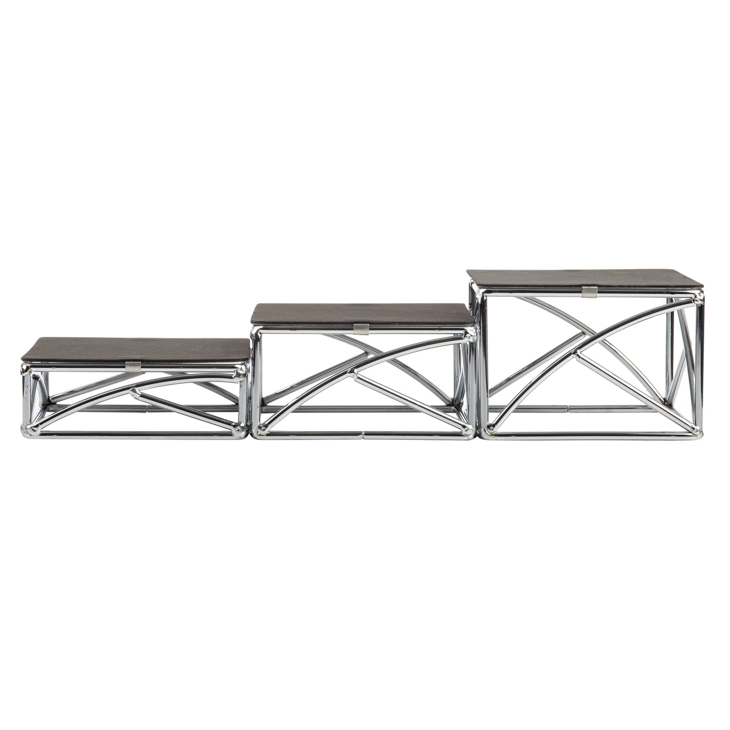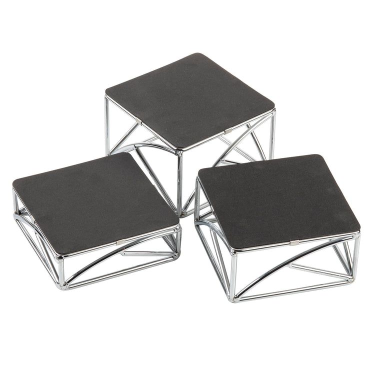 A commercial display riser set is a collection of sturdy, elevated platforms used to enhance the presentation of food items in professional settings. Comprised of multiple risers made from durable materials like chrome-plated metal, these sets enable precise height variation to showcase food attractively. Often installed in buffet lines, catering service stations, or display counters, they facilitate organizing and elevating dishes for visual impact and efficient space utilization. The Tablecraft CR3 Riser Set, with its three square risers, is designed specifically to meet the demands of high-volume catering and food presentation environments, offering reliable stability and easy cleaning to support professional foodservice operations.