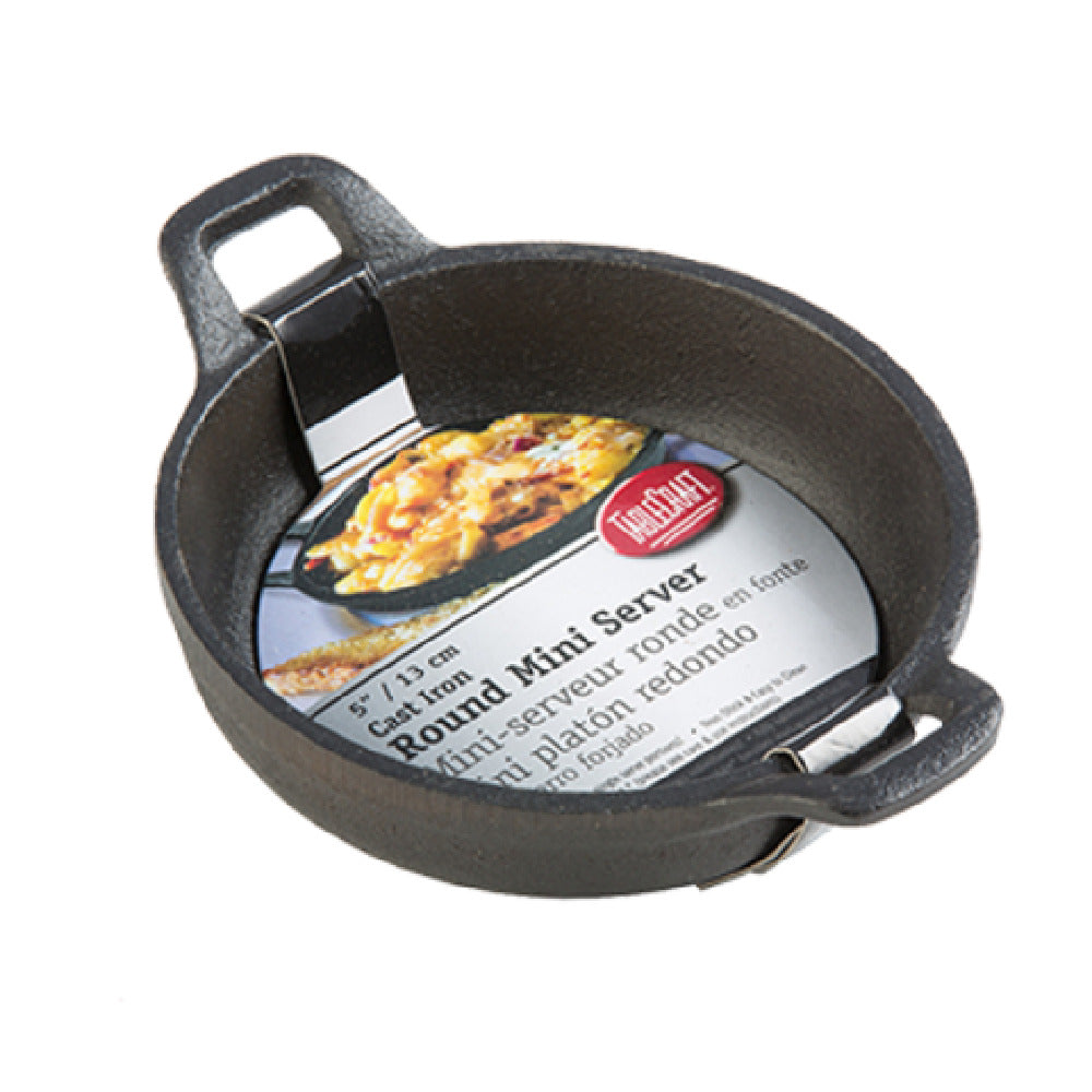 The Tablecraft CW30102 Mini Server is a compact, durable serving vessel designed for commercial foodservice environments. Constructed from cast iron, this mini server features a 8 oz. capacity with a 4-3/4" diameter and a height of 1-1/8", making it suitable for precise portion control and elegant presentation. Its round shape with integrated handles enhances handling and service efficiency, while the non-stick surface enables effortless cleaning and maintenance. Ideal for establishments requiring stylish, functional serveware, this model combines robust material properties with precise dimensional specifications tailored for professional use.