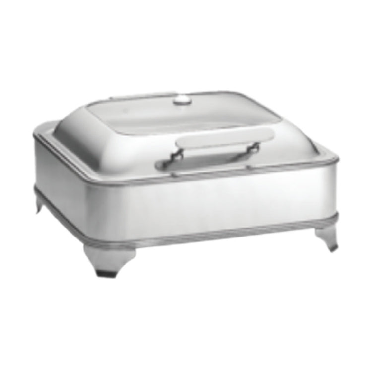 The electric chafer with stand offers precise temperature regulation through a 700-watt electric heater, while its stainless steel construction ensures longevity in high-volume settings. The drop-in design simplifies refilling and cleaning, with a hinged cover for ease of access. Its compact square profile adapts seamlessly into various buffet layouts, and its dishwasher-safe parts facilitate quick maintenance. Suitable for catering, banquet, and institutional foodservice environments, this model ensures consistent hot food delivery with minimal operational downtime.