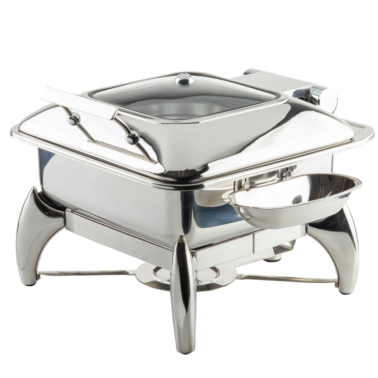 This fuel-powered chafer dish incorporates a robust stainless steel body with a sleek finish, designed for commercial catering and buffets. Its slow-close hinged cover with a viewing window facilitates monitoring without heat escape, while the included water basin and steam pan ensure even heat distribution. The unit’s sturdy stand provides stable placement, and dishwasher-safe components simplify cleaning. The 6-quart capacity supports medium throughput, suitable for hotel breakfast services or event catering operations providing sous-vide style warming and presentation.